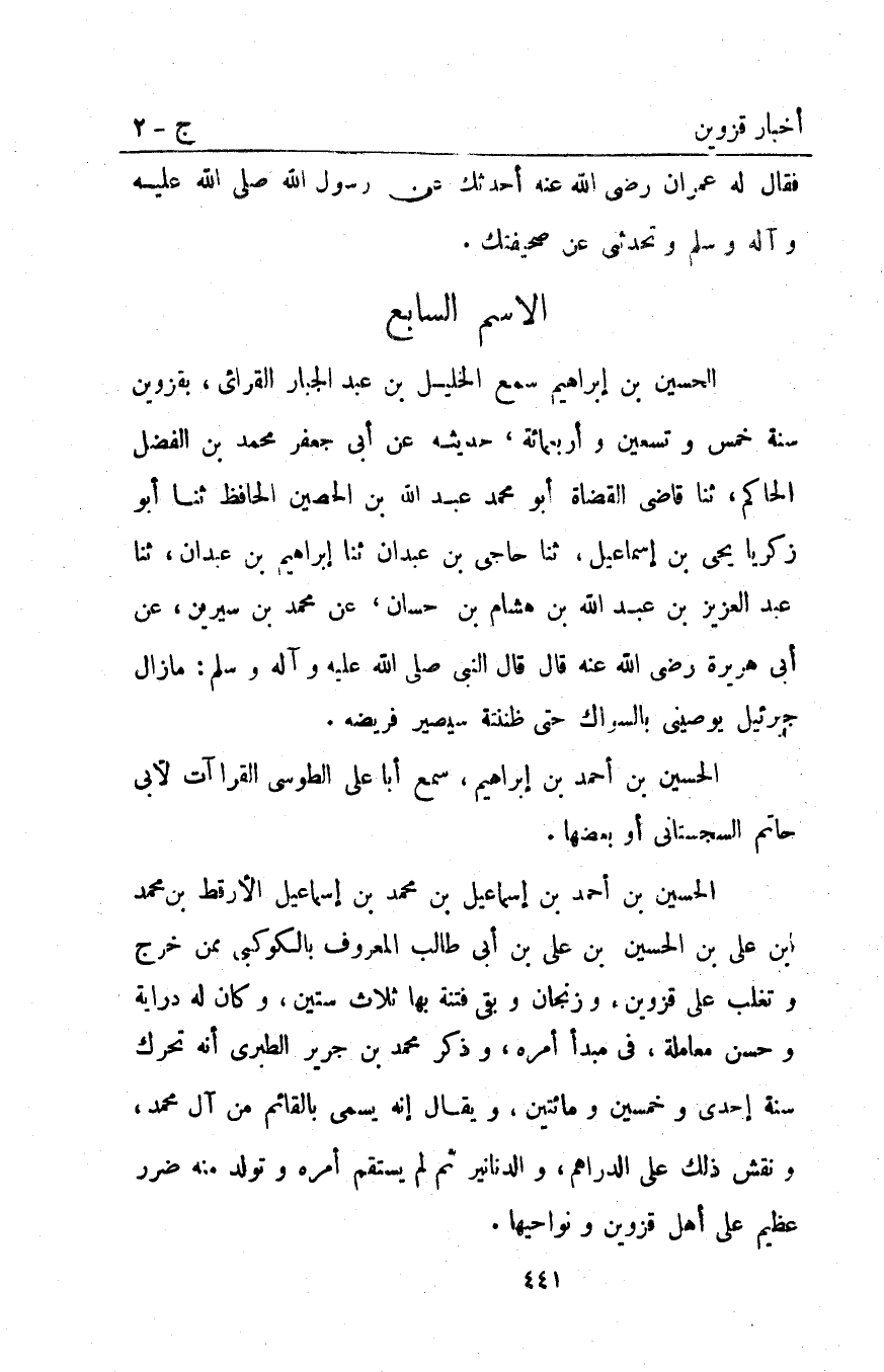 الْحُسَيْنُ بْنُ إبراهيم سمع الخليل بْن عَبْد الجبار الْقُرَّائِيَّ بِقَزْوِينَ سَنَةَ خَمْسٍ وَتِسْعِينَ وأربعمائة حَدِيثُهُ عَنْ أَبِي جَعْفَرٍ مُحَمَّدِ بْنِ الْفَضْلِ الْحَاكِمِ ثنا قَاضِي الْقُضَاةِ أَبُو مُحَمَّدٍ عَبْدُ اللَّهِ بْنُ الْحُصَيْنِ الْحَافِظُ ثنا أَبُو زَكَرِيَّا يَحْيَى بْنُ إِسْمَاعِيل ثنا حَاجِّيُّ بْنُ عَبْدَانَ ثنا إبراهيم بْنُ عَبْدَانَ ثنا عَبْدُ الْعَزِيزِ بْنُ عَبْدِ اللَّهِ بْنِ هِشَامِ بْن حسان عن مُحَمَّد بْن سِيرِينَ عَنْ أَبِي هُرَيْرَةَ رَضِيَ اللَّهُ عَنْهُ قَالَ قَالَ النَّبِيُّ صَلَّى اللَّهُ عَلَيْهِ وَآلِهِ وَسَلَّمَ مَا زَالَ جِبْرَئِيلُ يُوصِينِي بِالسِّوَاكِ حَتَّى ظَنَنْتُهُ سَيَصِيرُ فَرِيضَةً.