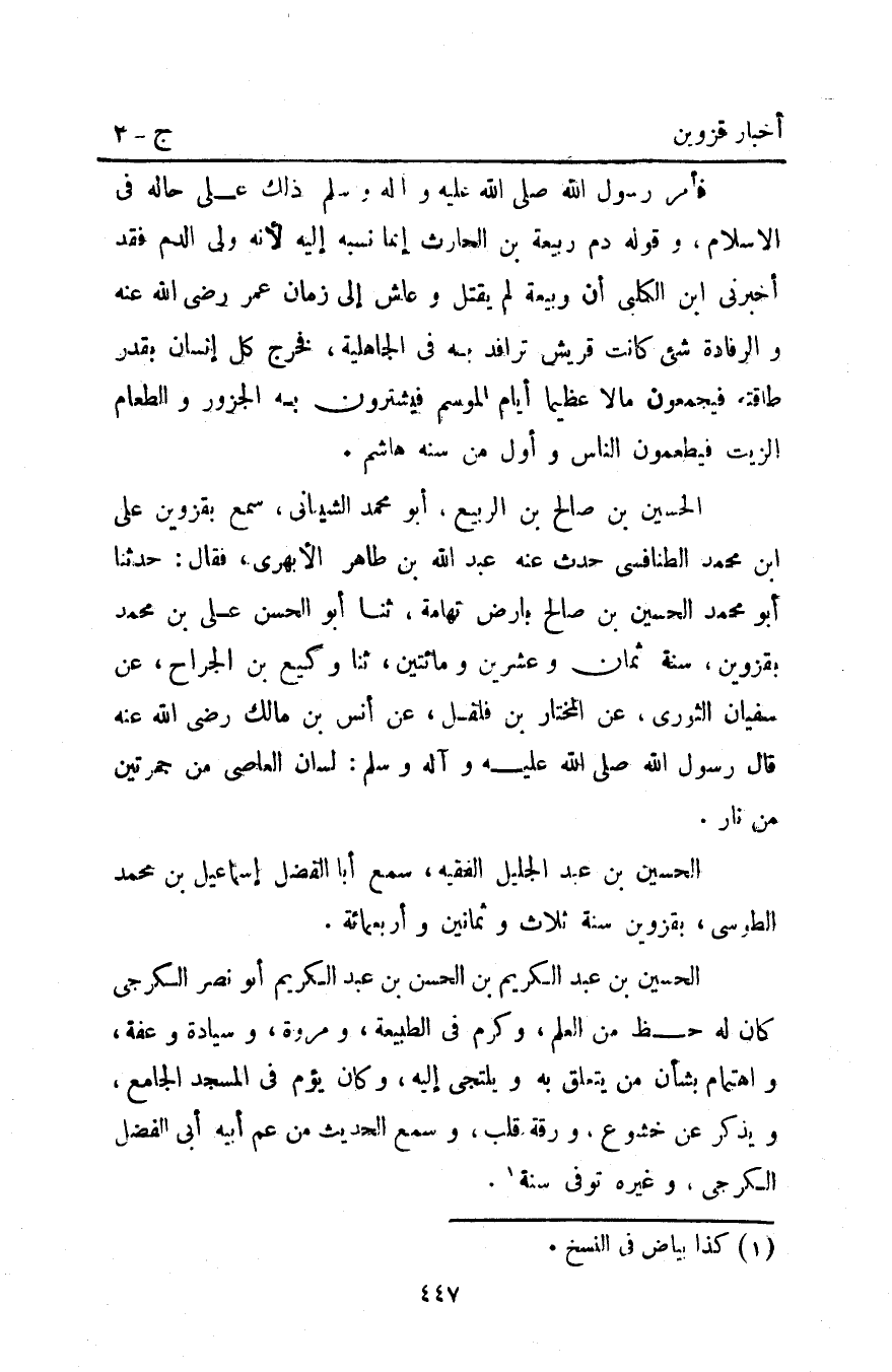 الْحُسَيْنُ بْنُ صَالِحِ بْنِ الرَّبِيعِ أَبُو مُحَمَّدٍ الشَّيْبَانِيُّ سَمِعَ بِقَزْوِينَ علي ابن مُحَمَّدٍ الطَّنَافِسِيَّ حَدَّثَ عَنْهُ عَبْدُ اللَّهِ بْنُ طَاهِرٍ الأَبْهَرِيُّ فَقَالَ حَدَّثَنَا أَبُو مُحَمَّدٍ الْحُسَيْنُ بْنُ صَالِحٍ بِأَرْضِ تِهَامَةَ ثنا أَبُو الْحَسَنِ عَلِيُّ بْنُ مُحَمَّدٍ بِقَزْوِينَ سَنَةَ ثَمَانٍ وَعِشْرِينَ وَمِائَتَيْنِ ثنا وَكِيعُ بْنُ الْجَرَّاحِ عَنْ سُفْيَانَ الثَّوْرِيِّ عَنِ الْمُخْتَارِ بْنِ فُلْفُلٍ عَنْ أَنَسِ بْنِ مَالِكٍ رَضِيَ اللَّهُ عَنْهُ قَالَ رَسُولُ اللَّهِ صَلَّى اللَّهُ عَلَيْهِ وَآلِهِ وَسَلَّمَ: "لسان العاصي من جَمْرَتَيْنِ مِنْ نَارٍ".