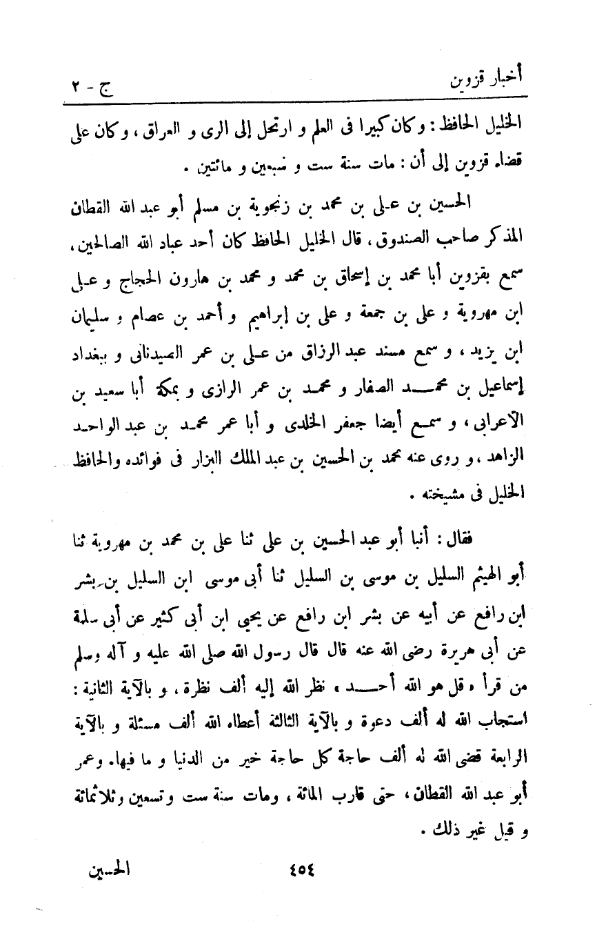 الخليل الحافظ وكان كبيرا فِي العلم وارتحل إِلَى الري والعراق وكان عَلَى قضاء قزوين إِلَى أن مات سنة ست وسبعين ومائتين.
