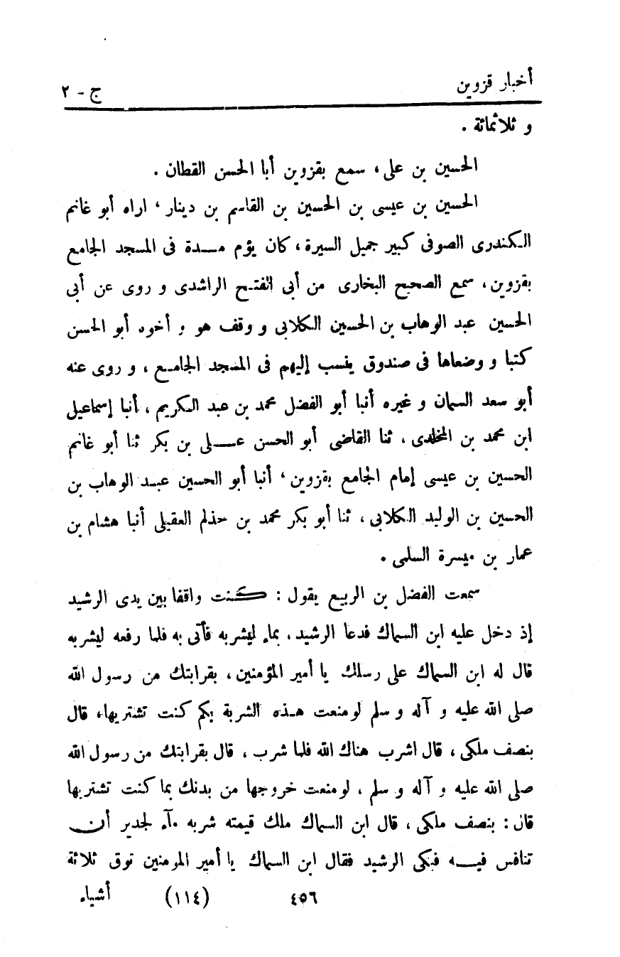 سمعت الفضل بْن الربيع يقول كنت واقفا بين يدي الرشيد إذ دخل عليه ابن السماك فدعا الرشيد بماء ليشربه فأتي به فيما رفعه يشربه قَالَ له ابن السماك عَلَى رسلك يا أمير المؤمنين بقرابتك من رَسُول اللَّهِ صَلَّى اللَّهُ عَلَيْهِ وَآلِهِ وَسَلَّمَ لو منعت هَذِهِ الشربة بكم كنت تشتريها قَالَ بنصف ملكي قَالَ اشرب هناك اللَّه فلما شرب قَالَ بقرابتك من رَسُول اللَّهِ صَلَّى اللَّهُ عَلَيْهِ وَآلِهِ وَسَلَّمَ لو منعت خروجها من بدنك بما كنت تشتريها قَالَ بنصف ملكي قَالَ ابن السماك ملك قيمته شربه ماء لجدير أن تنافس فيه فبكي الرشيد فقال ابن السماك يا أمير المؤمنين توق ثلاثة: