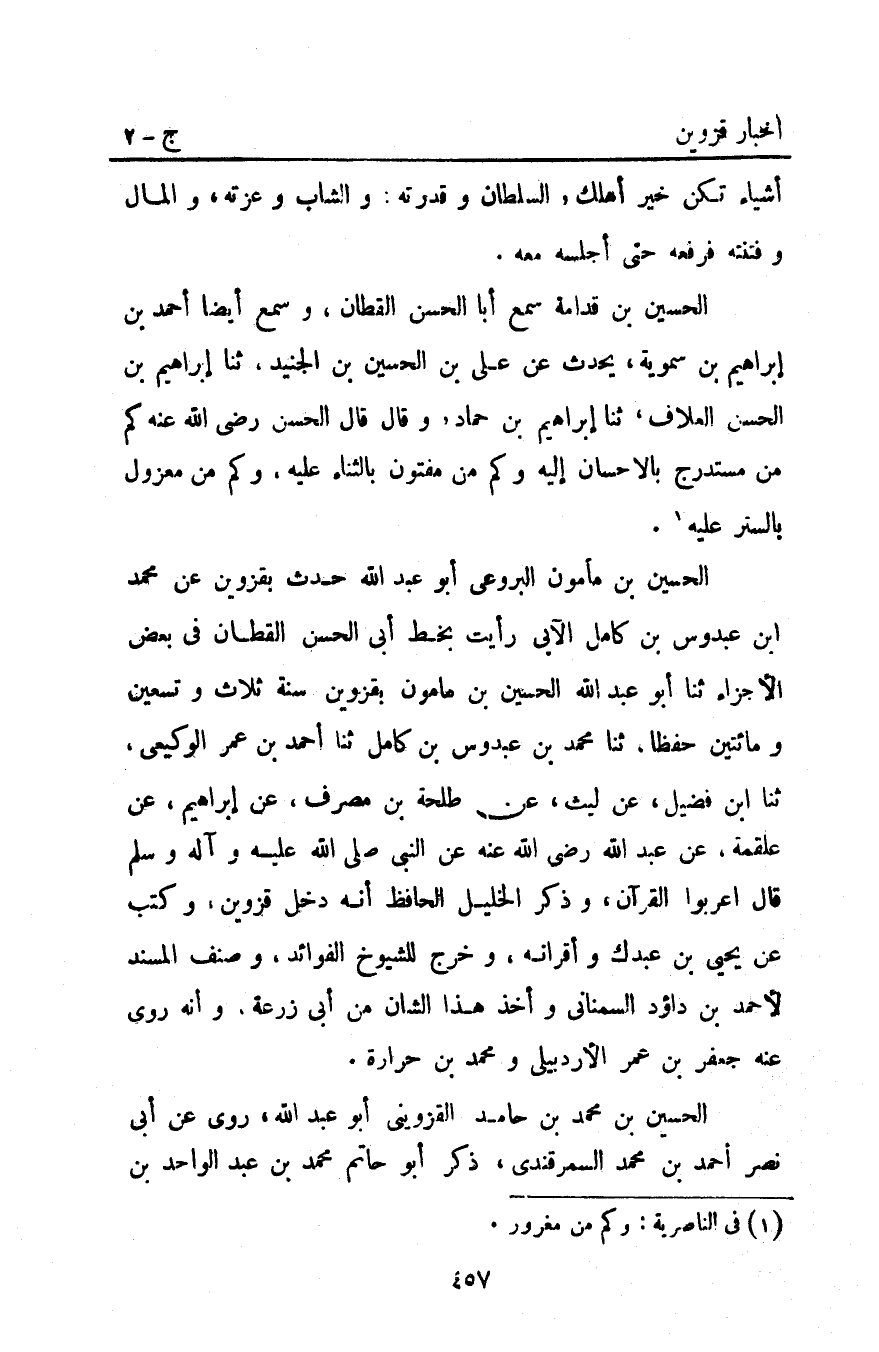 الْحُسَيْنُ بْنُ مَأْمُونٍ الْبَرْوَعِيُّ أَبُو عَبْدِ اللَّهِ حَدَّثَ بِقَزْوِينَ عَنْ محمد ابن عبدوس بْنِ كَامِلٍ الآبِي رَأَيْتُ بِخَطِّ أَبِي الْحَسَنِ الْقَطَّانِ فِي بَعْضِ الأَجْزَاءِ ثنا أَبُو عَبْدِ اللَّهِ الْحُسَيْنُ بْنُ مَأْمُونٍ بِقَزْوِينَ سَنَةَ ثَلاثٍ وَتِسْعِينَ وَمِائَتَيْنِ حِفْظًا ثنا محمد بن عبدوس بْنُ كَامِلٍ ثنا أَحْمَد بْنُ عُمَرَ الْوَكِيعِيُّ ثنا ابْنُ فُضَيْلٍ عَنْ لَيْثٍ عَنْ طَلْحَةَ بْنِ مُصَرِّفٍ عَنْ إبراهيم عَنْ عَلْقَمَةَ عَنْ عَبْدِ اللَّهِ رَضِيَ اللَّهُ عنه عن النبي صَلَّى اللَّهُ عليه وآله وَسَلَّمَ قَالَ: "أَعْرِبُوا الْقُرْآنَ" وذكر الخليل الحافظ أنه دخل قزوين وكتب عن يَحْيَى بْن عبدك وأقرانه وخرج للشيوخ الفوائد وصنف المسند لأحمد بن داؤد السمناني وأخذ هذا الشأن من أبي زرعة وأنه روى عَنْهُ جعفر بْن عمر الأردبيلي ومحمد بْن حرارة.