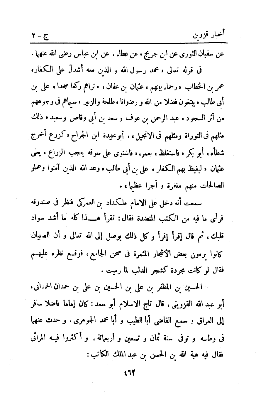 الحسين بْن المظفر بْن علي بْن الحسين بْن علي بْن حمدان الحمداني أَبُو عَبْد اللَّهِ الْقَزْوِينِيّ قَالَ تاج الإسلام أَبُو سعد كَانَ إماما فاضلا سافر إِلَى العراق وسمع القاضي أبا الطيب وأبا مُحَمَّد الجوهري وحدث عَنْهُمَا فِي وطنه وتوفي سنة ثمان وتسعين وأربعمائة وأكثروا فيه المراثي فقال فيه هبة اللَّه بْن الحسن بْن عبد الملك الكاتب: