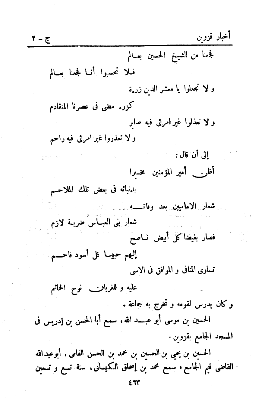 الحسين بْن مُوسَى أَبُو عَبْد اللَّهِ سمع أبا الحسن بْن إدريس فِي المسجد الجامع بِقَزْوِينَ.