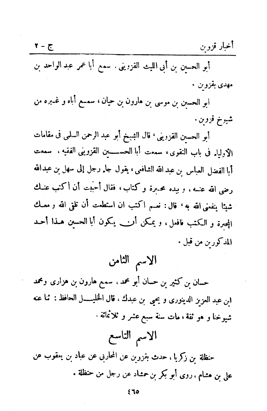 أَبُو الحسين الْقَزْوِينِيّ قَالَ الشيخ أَبُو عَبْد الرَّحْمَنِ السلمي فِي مقامات الأولياء فِي باب التقوى سمعت أبا الحسين الْقَزْوِينِيّ الفقيه سمعت أبا الفضل الْعَبَّاس بْن عَبْدِ اللَّهِ الشافعي يقول جاء رجل إِلَى سهل بْن عَبْدِ اللَّهِ رَضِيَ اللَّهُ عَنْهُ وبيده محبرة وكتاب فقال أحببت أن أكتب عنك شيئا ينفعني اللَّه به قَالَ نعم اكتب إن استطعت أن تلقي اللَّه ومعك المحبرة والكتب فافعل ويمكن أن يكون أبا الحسين هذا أحد المذكورين من قبل.