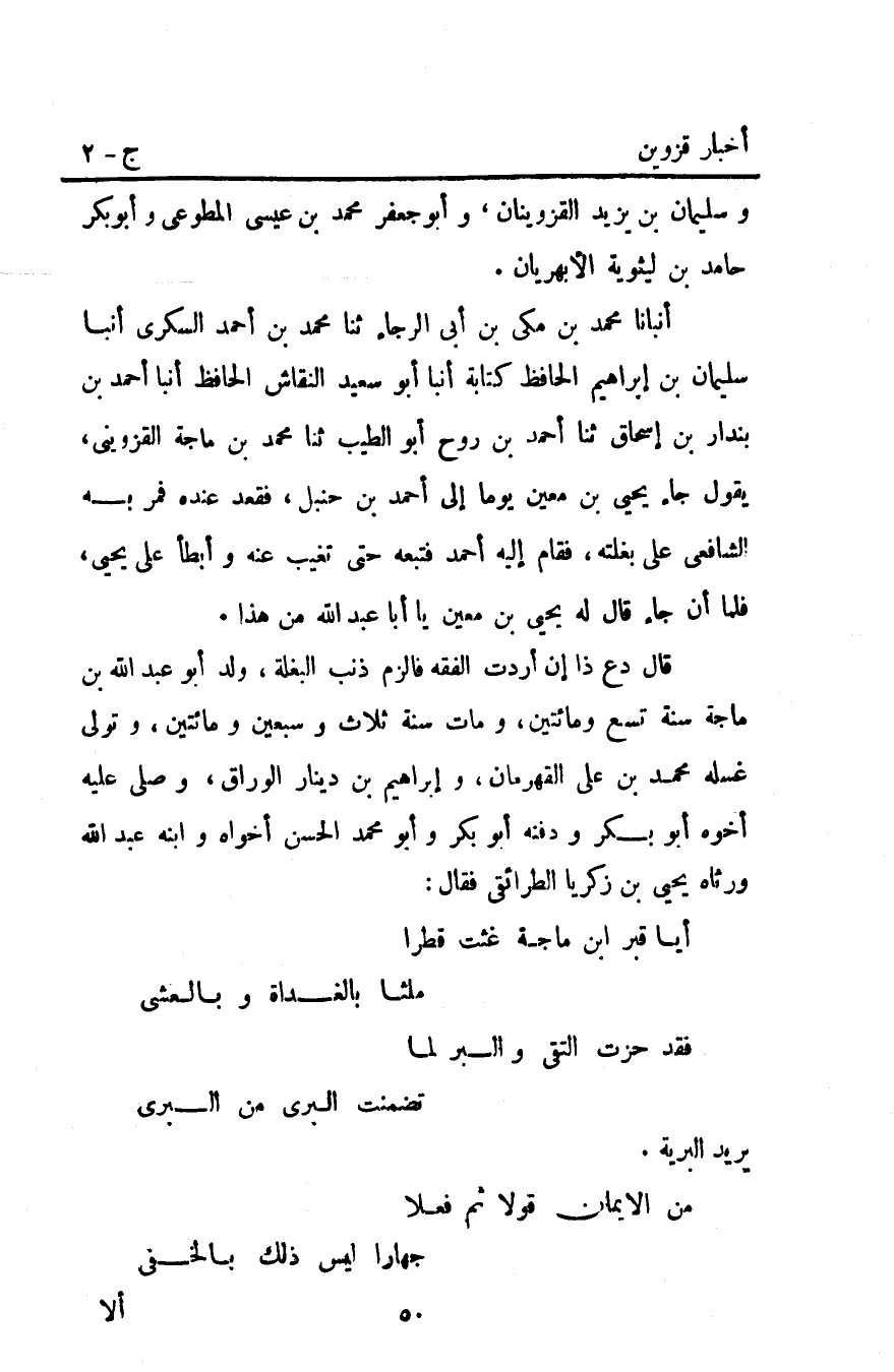 قَالَ دع ذا إن أردت الفقه فالزم ذنب البغلة ولد أَبُو عَبْد اللَّهِ بْن ماجه سنة تسع ومائتين ومات سنة ثلاث وسبعين ومائتين وتولى غسله مُحَمَّد بْن علي القهرمان وإبراهيم بْن دينار الوراق وصلى عليه أخوه أَبُو بكر ودفنه أَبُو بكر وأبو مُحَمَّد الحسن أخواه وابنه عَبْد اللَّهِ ورثاه يَحْيَى بْن زَكَرِيَّا الطرائقي فقال: