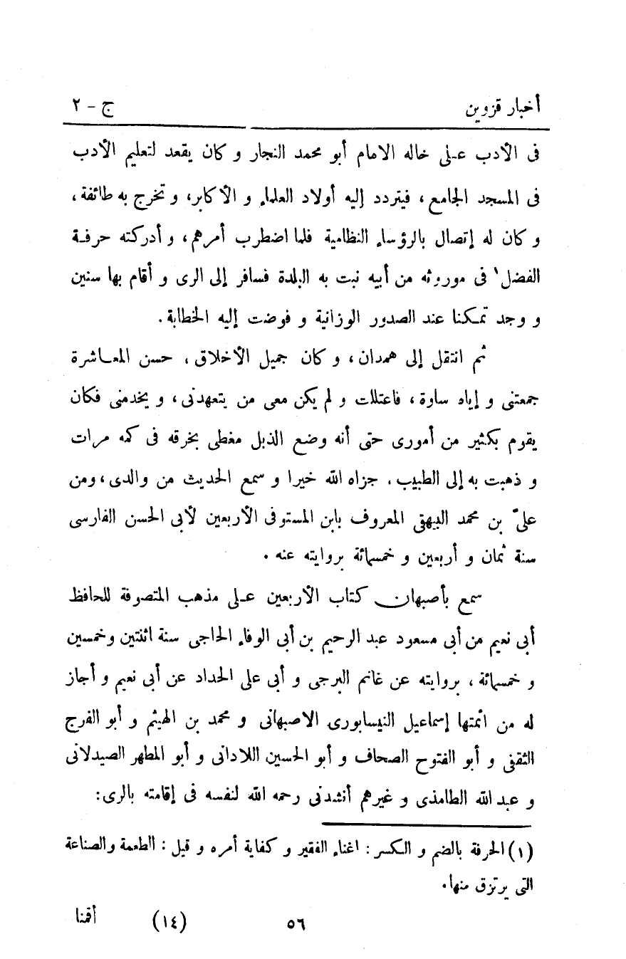 فِي الأدب عَلَى خاله الإمام أَبُو مُحَمَّد النجار وكان يقعد لتعليم الأدب فِي المسجد الجامع فيتردد إليه أولاد العلماء والأكابر وتخرج به طائفة وكان له اتصال بالرؤساء النظامية فلما اضطرب أمرهم وأدركته حرفة الفضل1 فِي موروثه من أبيه نبت به البلدة فسافر إِلَى الري وأقام بها سنين وو جد تمكنا عند الصدور الوزانية وفوضت إليه الخطابة.
