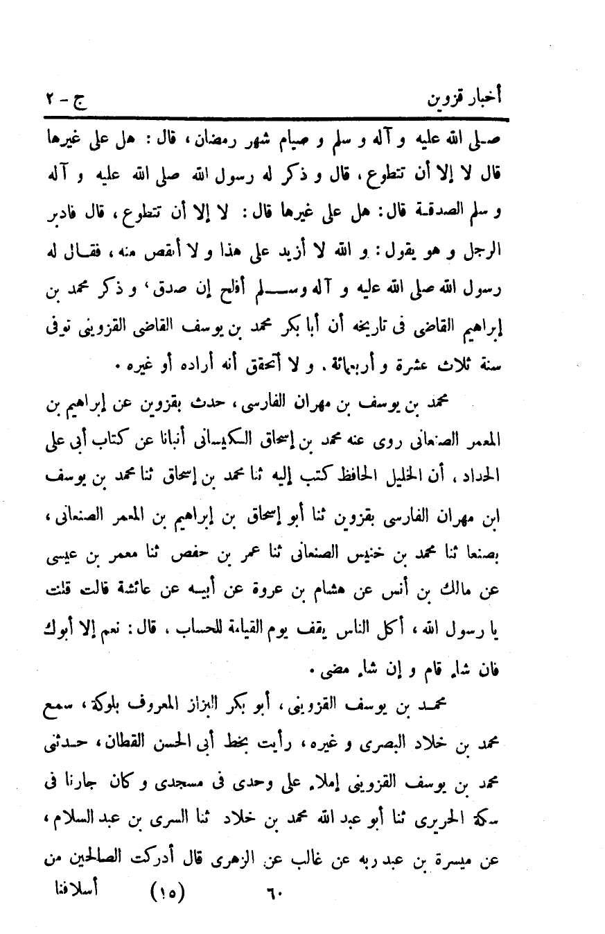 صَلَّى اللَّهُ عَلَيْهِ وَآلِهِ وَسَلَّمَ: "وَصِيَامُ شَهْرِ رَمَضَانَ" قَالَ هَلْ عَلَيَّ غَيْرُهَا قَالَ: "لا إِلا أَنْ تَتَطَوَّعَ" قَالَ وَذَكَرَ لَهُ رَسُولُ اللَّهِ صَلَّى اللَّهُ عَلَيْهِ وآله وَسَلَّمَ الصَّدَقَةَ قَالَ هَلْ عَلَيَّ غَيْرُهَا قَالَ: "لا إِلا أَنْ تَتَطَوَّعَ" قَالَ فَأَدْبَرَ الرَّجُلُ وَهُوَ يَقُولُ وَاللَّهِ لا أَزِيدُ عَلَى هَذَا وَلا أُنْقِصُ مِنْهُ فَقَالَ لَهُ رَسُولُ اللَّهُ صَلَّى اللَّهُ عليه وآله وَسَلَّمَ: "أَفْلَحَ إِنْ صَدَقَ" وذكر مُحَمَّد بْن إبراهيم القاضي في تاريخه أن أبا بكر مُحَمَّد بْن يوسف القاضي الْقَزْوِينِيّ توفي سنة ثلاث عشرة وأربعمائة ولا أتحقق أنه أراده أو غيره.