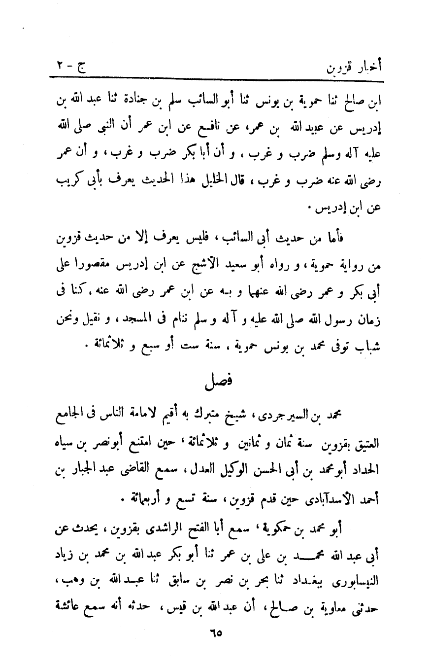 أَبُو مُحَمَّد بْن حمكويه سمع أبا الفتح الراشدي بِقَزْوِينَ يحدث عن أبي عَبْد اللَّه مُحَمَّد بْنُ عَلِيِّ بْنِ عُمَرَ ثَنَا أَبُو بَكْرٍ عَبْدُ اللَّهِ بْنُ مُحَمَّدِ بْنِ زِيَادٍ النَّيْسَابُورِيُّ بِبَغْدَادَ ثنا بَحْرُ بْنُ نَصْرِ بْنِ سَابِقٍ ثنا عَبْدُ اللَّهِ بْنُ وَهْبٍ حَدَّثَنِي مُعَاوِيَةُ بْنُ صَالِحٍ أَنَّ عَبْدَ اللَّهِ بْنَ قَيْسٍ حدثه أنه سمع عائشة
