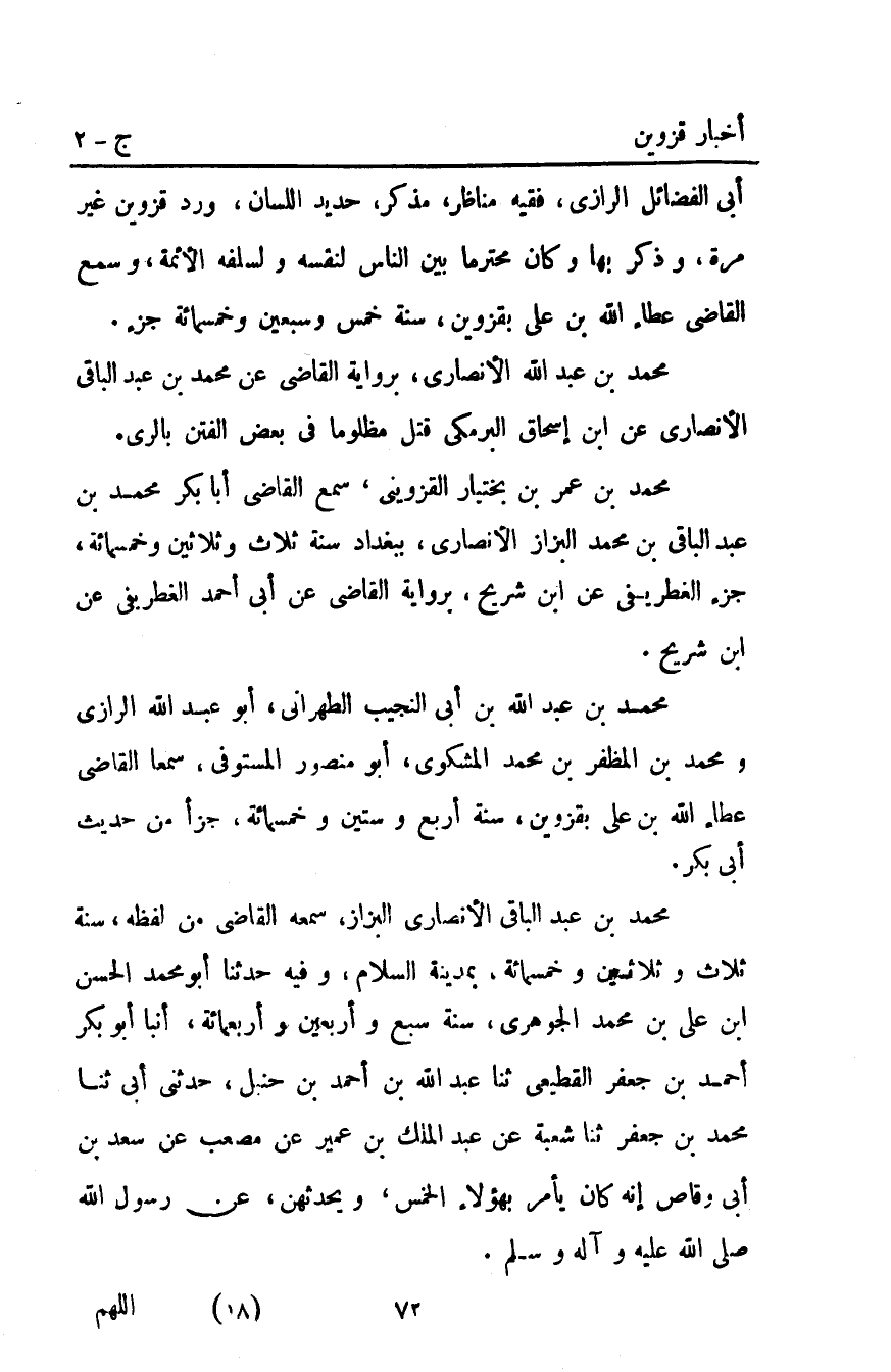 مُحَمَّد بْن عمر بْن بختيار الْقَزْوِينِيّ سمع القاضي أبا بكر مُحَمَّد بْن عَبْدِ الباقي بْن مُحَمَّد البزاز الأنصاري ببغداد سنة ثلاث وثلاثين وخمسمائة جزء الغطريفي عن ابن شريح برواية القاضي عن أبي أَحْمَد الغطريفي عن ابن شريح.