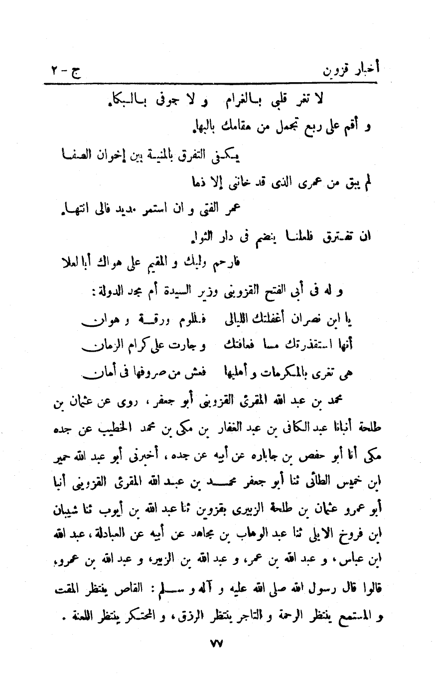 محمد بن عبد الله المقرىء الْقَزْوِينِيّ أَبُو جعفر روى عن عثمان بْن طلحة أَنْبَأَنَا عَبْدُ الْكَافِي بْنُ عَبْدِ الْغَفَّارِ بْنِ مَكِّيِّ بْنِ مُحَمَّدٍ الْخَطِيبِ عَنْ جَدِّهِ مَكِّيٍّ أنا أَبُو حَفْصِ بْنُ جَابَارَهْ عَنْ أَبِيهِ عَنْ جَدِّهِ أَخْبَرَنِي أَبُو عَبْدِ اللَّهِ حمير ابن خَمِيسٍ الطَّائِيُّ ثنا أَبُو جَعْفَرٍ محمد بن عبد الله المقرىء الْقَزْوِينِيُّ أَنْبَأَ أَبُو عُمَرَ عُثْمَانُ بْنُ طَلْحَةَ الزُّبَيْرِيُّ بِقَزْوِينَ ثنا عَبْدُ اللَّهِ بْنُ أَيُّوبَ ثنا شيبان ابن فَرُّوخٍ الأَيْلِيُّ ثنا عَبْدُ الْوَهَّابِ بْنِ مُجَاهِدٍ عَنْ أَبِيهِ عَنِ العبادلة عبد الله ابن عَبَّاسٍ وَعَبْدِ اللَّهِ بْنِ عُمَرَ وَعَبْدِ اللَّهِ بْنِ الزُّبَيْرِ وَعَبْدِ اللَّهِ بْنِ عَمْرٍو قَالُوا قَالَ رَسُولُ اللَّهِ صَلَّى اللَّهُ عَلَيْهِ وآله وَسَلَّمَ: "الْقَاصُّ يَنْتَظِرُ الْمَقْتِ وَالْمُسْتَمِعُ يَنْتَظِرُ الرَّحْمَةَ وَالتَّاجِرُ يَنْتَظِرُ الرِّزْقَ والمحتكر ينتظر اللعنة".