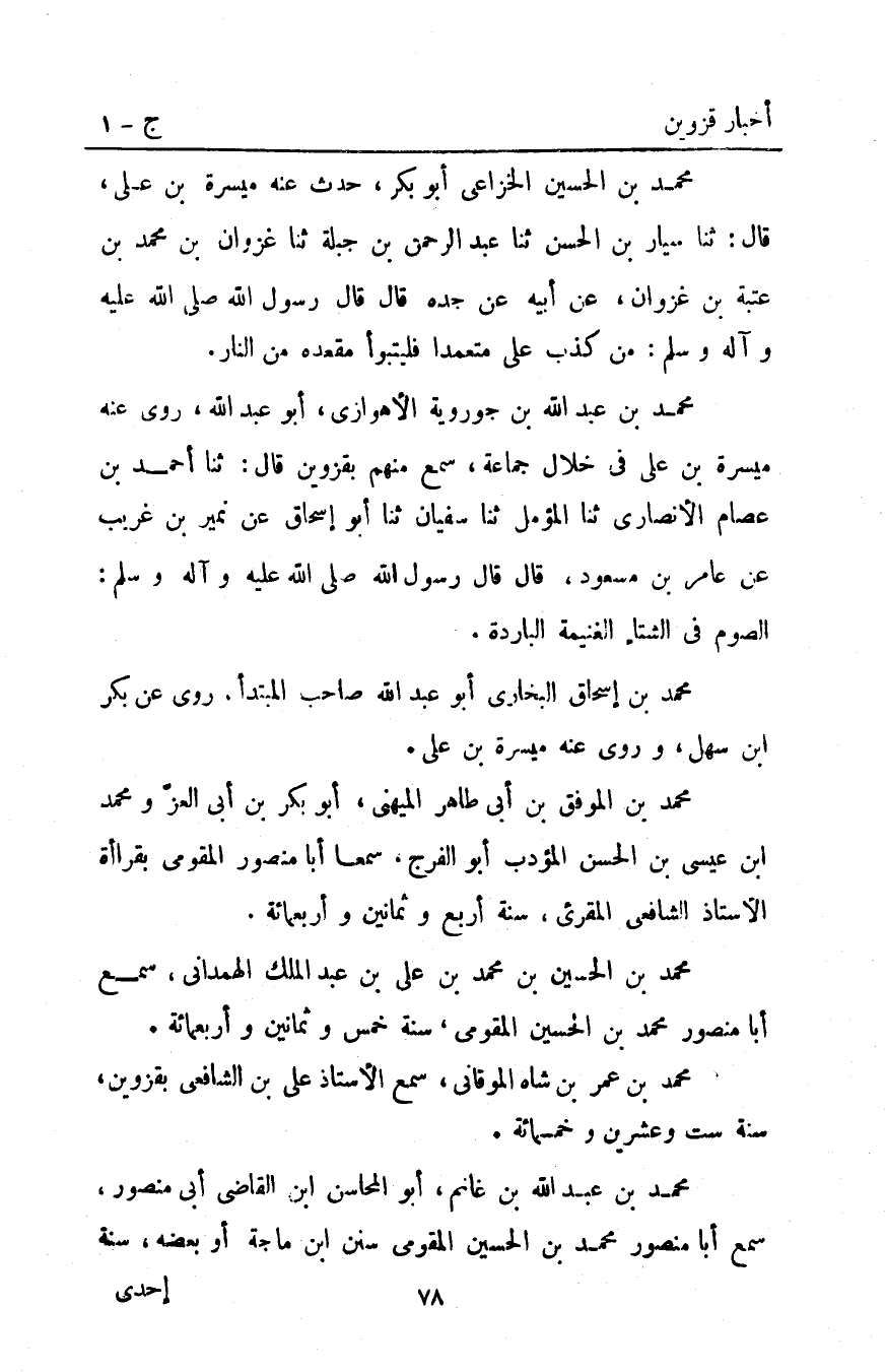 مُحَمَّد بْن الحسين الخزاعي أَبُو بكر حدث عَنْهُ ميسرة بْن علي قَالَ ثنا سَيَّارُ بْنُ الْحَسَنِ ثنا عَبْد الرَّحْمَنِ بْنُ جَبَلَةَ ثنا غَزْوَانُ بْنُ مُحَمَّدِ بْنِ عُتْبَةَ بْنِ غَزْوَانَ عَنْ أَبِيهِ عَنْ جَدِّهِ قَالَ: قَالَ رَسُولُ اللَّهِ صَلَّى اللَّهُ عَلَيْهِ وآله وَسَلَّمَ: "مَنْ كَذَبَ عَلَيَّ مُتَعَمِّدًا فَلْيَتَبَوَّأْ مَقْعَدَهُ مِنَ النَّارِ".