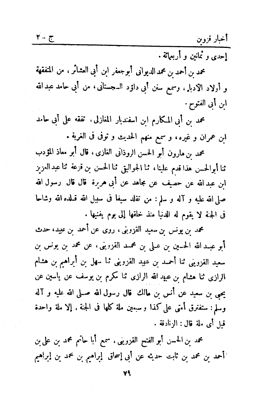 مُحَمَّدُ بْنُ يُونُسَ بْنِ سَعِيدٍ الْقَزْوِينِيُّ رَوَى عَنْ أَحْمَدَ بْنِ عُبَيْدٍ حَدَّثَ أَبُو عَبْدِ اللَّهِ الْحُسَيْنُ بْنُ عَلِيِّ بْنِ مُحَمَّدٍ الْقَزْوِينِيُّ عَنْ مُحَمَّدِ بْنِ يُونُسَ بْنِ سَعِيدٍ الْقَزْوِينِيِّ ثنا أَحْمَدُ بْنُ عُبَيْدٍ الْقَزْوِينِيُّ ثنا سَهْلُ بْنُ إِبْرَاهِيمَ بْنِ هِشَامٍ الرَّازِيُّ ثنا هِشَامُ بْنُ عُبَيْدِ اللَّهِ الرَّازِيُّ ثنا مُكْرَمُ بْنُ يُوسُفَ عَنْ يَاسِينَ عَنْ يَحْيَى بْنِ سَعِيدٍ عَنْ أَنَسِ بْنِ مَالِكٍ قَالَ رَسُولُ اللَّهِ صَلَّى اللَّهُ عَلَيْهِ وآله وَسَلَّمَ: "سَتَفْتَرِقُ أُمَّتِي عَلَى كَذَا وَسَبْعِينَ مِلَّةٍ كُلِّهَا فِي الْجَنَّةِ إِلا مِلَّةً وَاحِدَةً قِيلَ أَيُّ مِلَّةٍ قَالَ الزَّنَادِقَةُ".