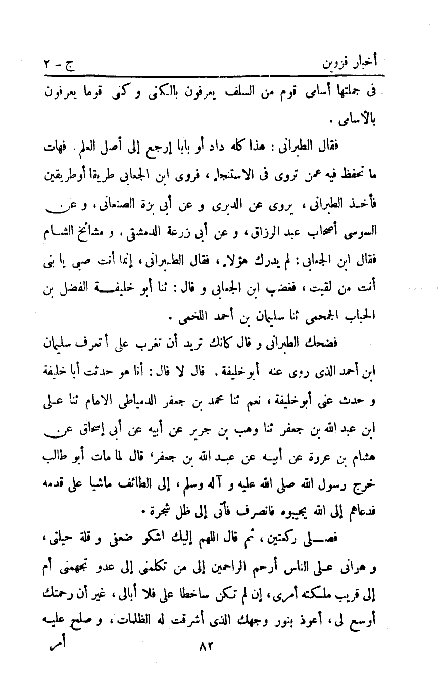 فقال الطبراني هذا كله داد أو بابا ارجع إِلَى أصل العلم فهات ما تحفظ فيه عمن تروي فِي الاستنجاء فروي ابن الجعابي طريقا أو طريقين فأخذ الطبراني يروي عن الدبري وعن أبي بزة الصنعاني وعن السوسي أصحاب عَبْد الرزاق وعن أبي زرعة الدمشقي ومشائخ الشام فقال ابن الجعابي لم يدرك هؤلاء فقال الطبراني إنما أنت صبي يا بني أنت من لقيت فغضب ابن الجعابي وقال ثنا أَبُو خليفة الفضل بْن الحباب الجمجمي ثنا سليمان بْن أَحْمَد اللخمي. فضحك الطبراني وقال كأنك تريد أن تغرب علي أتعرف سليمان ابن أَحْمَد الذي روى عَنْهُ أَبُو خليفة قَالَ لا قَالَ أنا هو حدثت أبا خليفة وحدث عني أَبُو خليفة نعم ثنا مُحَمَّدُ بْنُ جَعْفَرٍ الدِّمْيَاطِيُّ الإِمَامُ ثنا على ابن عَبْدُ اللَّهِ بْنُ جَعْفَرٍ ثَنَا وَهْبُ بْنُ جَرِيرٍ عَنْ أَبِيهِ عَنْ أَبِي إِسْحَاقَ عَنْ هِشَامِ بْن عروة عن أبيه عن عَبْدُ اللَّهِ بْنُ جَعْفَرٍ قَالَ لَمَّا مَاتَ أَبُو طَالِبٍ خَرَجَ رَسُولُ اللَّهِ صَلَّى اللَّهُ عَلَيْهِ وآله وَسَلَّمَ إِلَى الطَّائِفِ مَاشِيًا عَلَى قَدَمِهِ فَدَعَاهُمْ إِلَى اللَّهِ يُجِيبُوهُ فَانْصَرَفَ فَأَتَى إِلَى ظِلِّ شَجَرَةٍ.