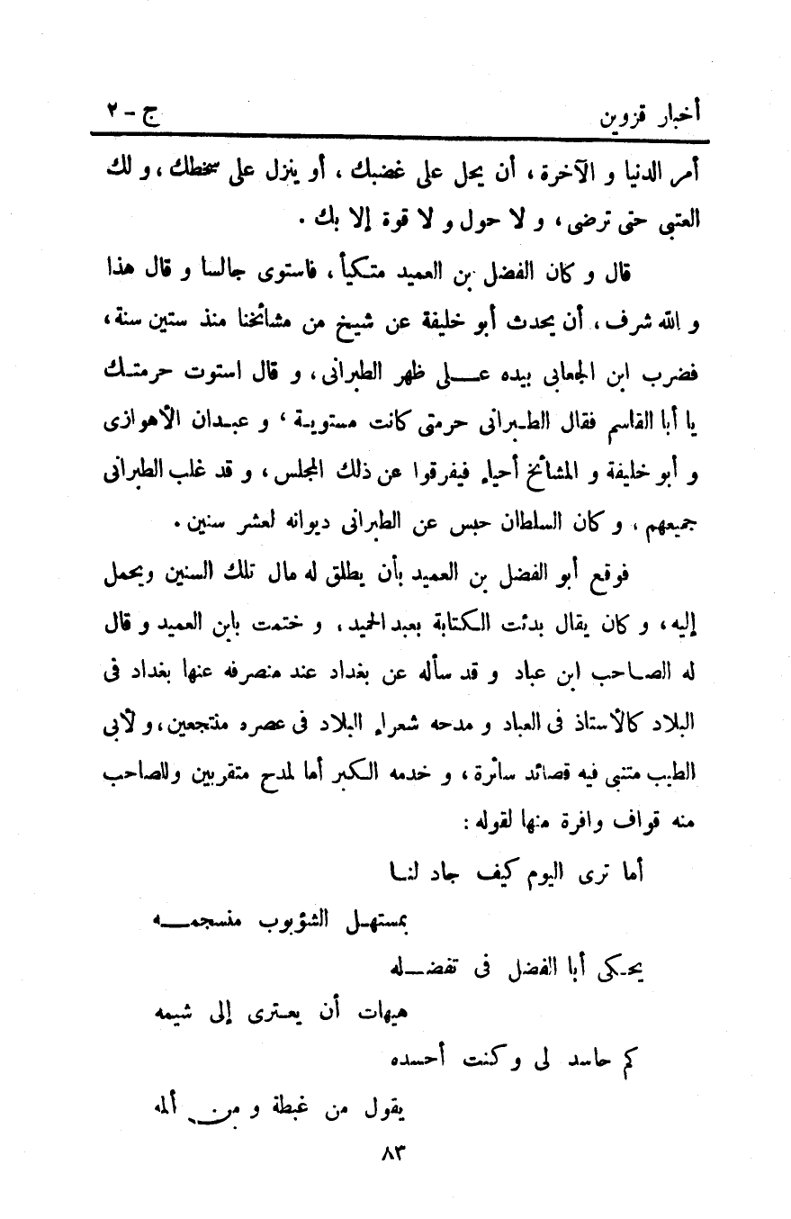 فوقع أَبُو الفضل بْن العميد بأن يطلق له مال تلك السنين ويحمل إليه وكان يقال بدئت الكتابة بعد الحميد وختمت بابن العميد وقال له الصاحب ابن عباد وقد سأله عن بغداد عند منصرفه عَنْهُ بغداد فِي البلاد كالأستاذ فِي العباد ومدحه شعراء البلاد في عصره منتجعين ولأبي الطيب متنبي فيه قصائد سائرة وخدمه الكبر أما لمدح متقربين وللصاحب منه قواف وافرة منها لقوله: