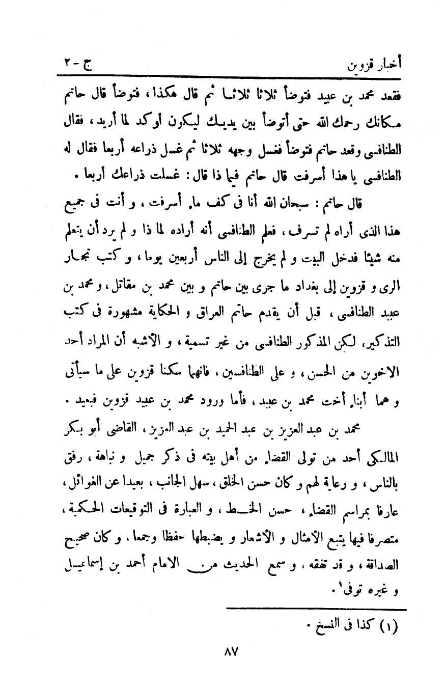 قَالَ حاتم سبحان اللَّه أنا فِي كف ماء أسرفت وأنت في جميع هذا الذي أراه لم تسرف فعلم الطنافسي أنه أراده لماذا ولم يرد أن يتعلم منه شيئا فدخل البيت ولم يخرج إِلَى الناس أربعين يوما وكتب تجار الري وقزوين إِلَى بغداد ما جري بين حاتم وبين مُحَمَّد بْن مقاتل ومحمد بْن عبيد الطنافسي قبل أن يقدم حاتم العراق والحكاية مشهورة فِي كتب التذكير لكن المذكور الطنافسي من غير تسمية والأشبه أن المراد أحد الأخوين من الحسن وعَلَى الطنافسين فإنهما سكنا قزوين عَلَى ما سيأتي وهما أبناء أخت مُحَمَّد بْن عبيد فأما ورود مُحَمَّد بْن عبيد قزوين فبعيد.