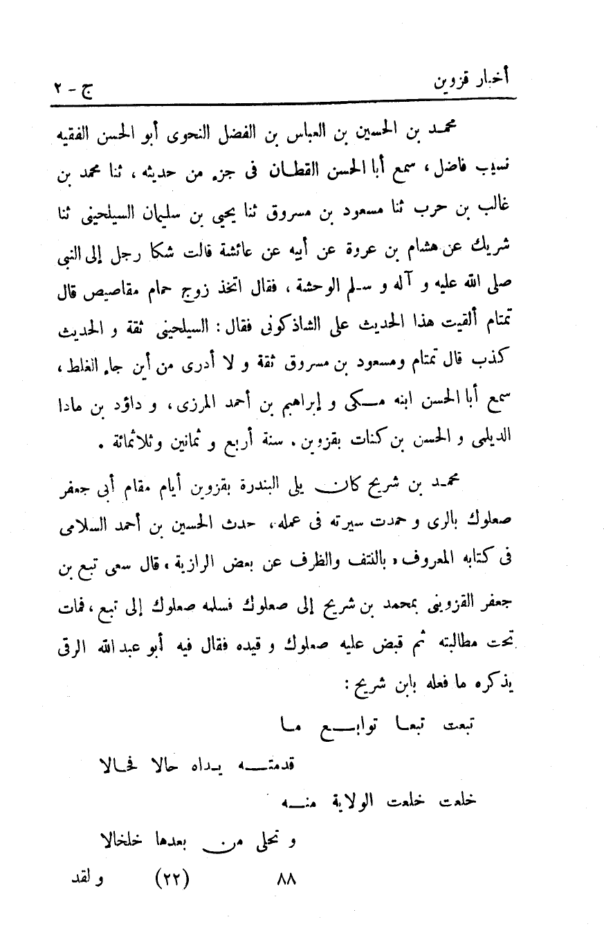 مُحَمَّدُ بْنُ الْحُسَيْنُ بْنُ الْعَبَّاسِ بْنِ الْفَضْلِ النَّحْوِيُّ أَبُو الْحَسَنِ الفقيه نَسِيبٌ فَاضِلٌ سَمِعَ أَبَا الْحَسَنِ الْقَطَّانَ فِي جُزْءٍ مِنْ حَدِيثِهِ ثنا مُحَمَّدُ بْنُ غَالِبِ بْنِ حَرْبٍ ثنا مَسْعُودُ بْنُ مَسْرُوقٍ ثنا يَحْيَى بْنُ سُلَيْمَانَ السَّيْلَحِينِيُّ ثنا شَرِيكٌ عَنْ هِشَامِ بْن عروة عن أبيه عن عَائِشَةَ قَالَتْ شَكَا رَجُلٌ إِلَى النَّبِيَّ صَلَّى اللَّهُ عَلَيْهِ وَآلِهِ وسلم صَلَّى اللَّهُ عَلَيْهِ وَآلِهِ وَسَلَّمَ الْوَحْشَةَ فَقَالَ: "اتَّخِذْ زَوْجَ حَمَامٍ مَقَاصِيصَ" قَالَ تمتام ألقيت هذا الحديث عَلَى الشاذكوني فقال السيلحيني ثقة والحديث كذب قَالَ تمتام ومسعود بْن مسروق ثقة ولا أدري من أين جاء الغلط سمع أبا الحسن ابنه مكي وإبراهيم بْن أَحْمَد المرزي وداؤد بْن مادا الديلمي والحسن بْن كنات بِقَزْوِينَ سنة أربع وثمانين وثلاثمائة.