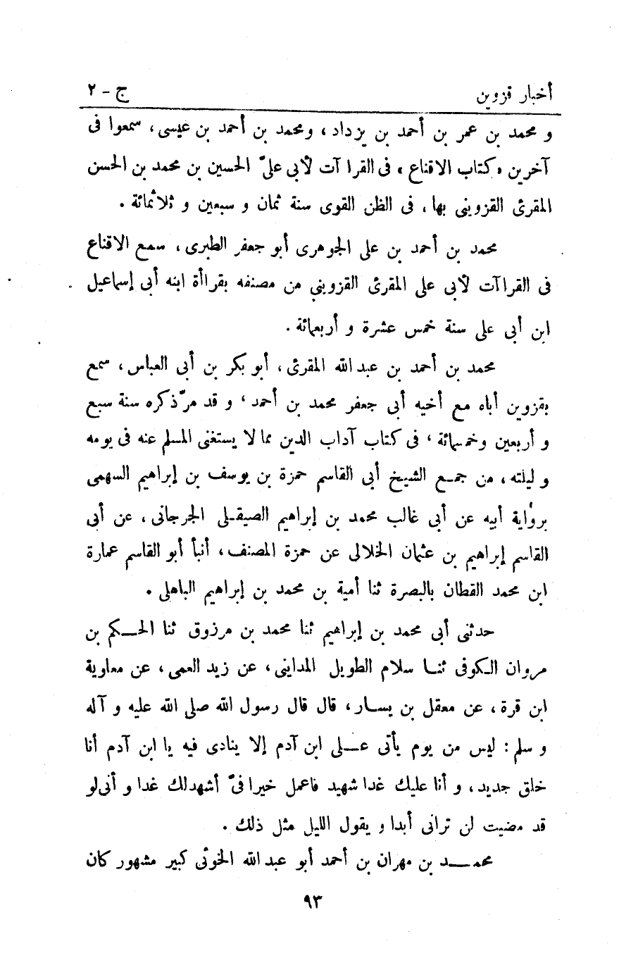 ومحمد بْن عمر بْن أَحْمَد بْن يزداد ومحمد بْن أَحْمَد بْن عِيسَى سمعوا فِي آخرين كتاب الإقناع في القرا آت لأبي عَلَى الحسين بْن مُحَمَّد بن الحسن المقرىء الْقَزْوِينِيّ بها فِي الظن القوي سنة ثمان وسبعين وثلاثمائة.