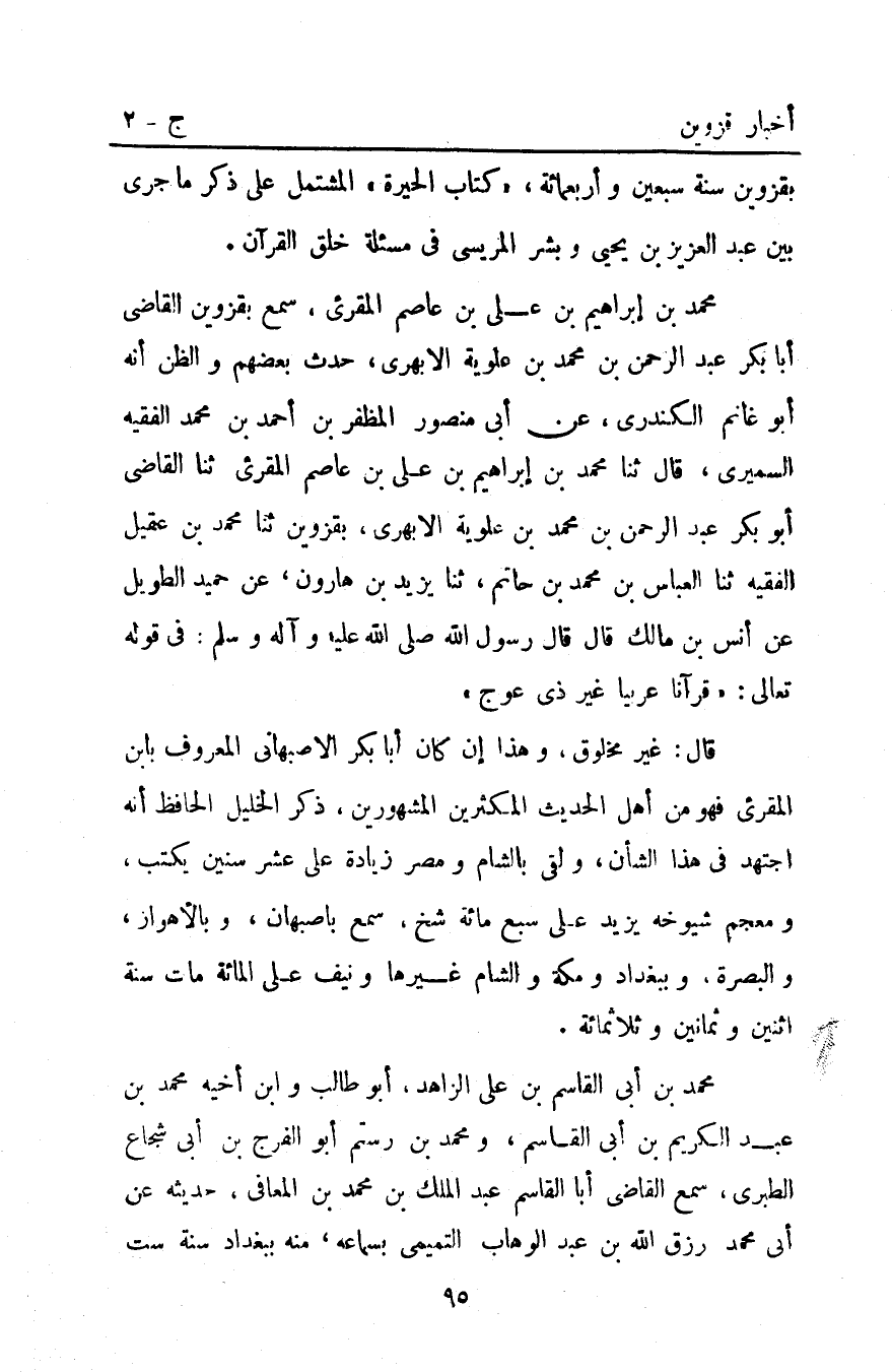 مُحَمَّد بْن إبراهيم بن علي بن عاصم المقرىء سمع بِقَزْوِينَ القاضي أبا بكر عَبْدُ الرَّحْمَنِ بْنِ مُحَمَّدِ بْنِ علويه الأبهري حدث بعضهم والظن أنه أَبُو غانم الكندري عَنْ أَبِي مَنْصُورٍ الْمُظَفَّرُ بْنُ أَحْمَدَ بْنِ مُحَمَّدٍ الْفَقِيهُ السُّمَيْرِيُّ قَالَ ثَنَا مُحَمَّدُ بْنُ إِبْرَاهِيمَ بْنِ علي بن عاصم المقرىء ثنا الْقَاضِي أَبُو بَكْرٍ عَبْدُ الرَّحْمَنِ بْن مُحَمَّد بْن علويه الأَبْهَرِيُّ بِقَزْوِينَ ثنا مُحَمَّدُ بْنُ عَقِيلٍ الْفَقِيهُ ثنا الْعَبَّاسُ بْنُ مُحَمَّدِ بْنِ حَاتِمٍ ثنا يَزِيدُ بْنُ هَارُونَ عَنْ حُمَيْدٍ الطَّوِيلِ عَنْ أَنَسِ بْنِ مَالِكٍ قَالَ: قَالَ رَسُولُ اللَّهِ صَلَّى اللَّهُ عليه وآله وسلم: في قوله تعالى: {قُرْآناً عَرَبِيّاً غَيْرَ ذِي عِوَجٍ} .