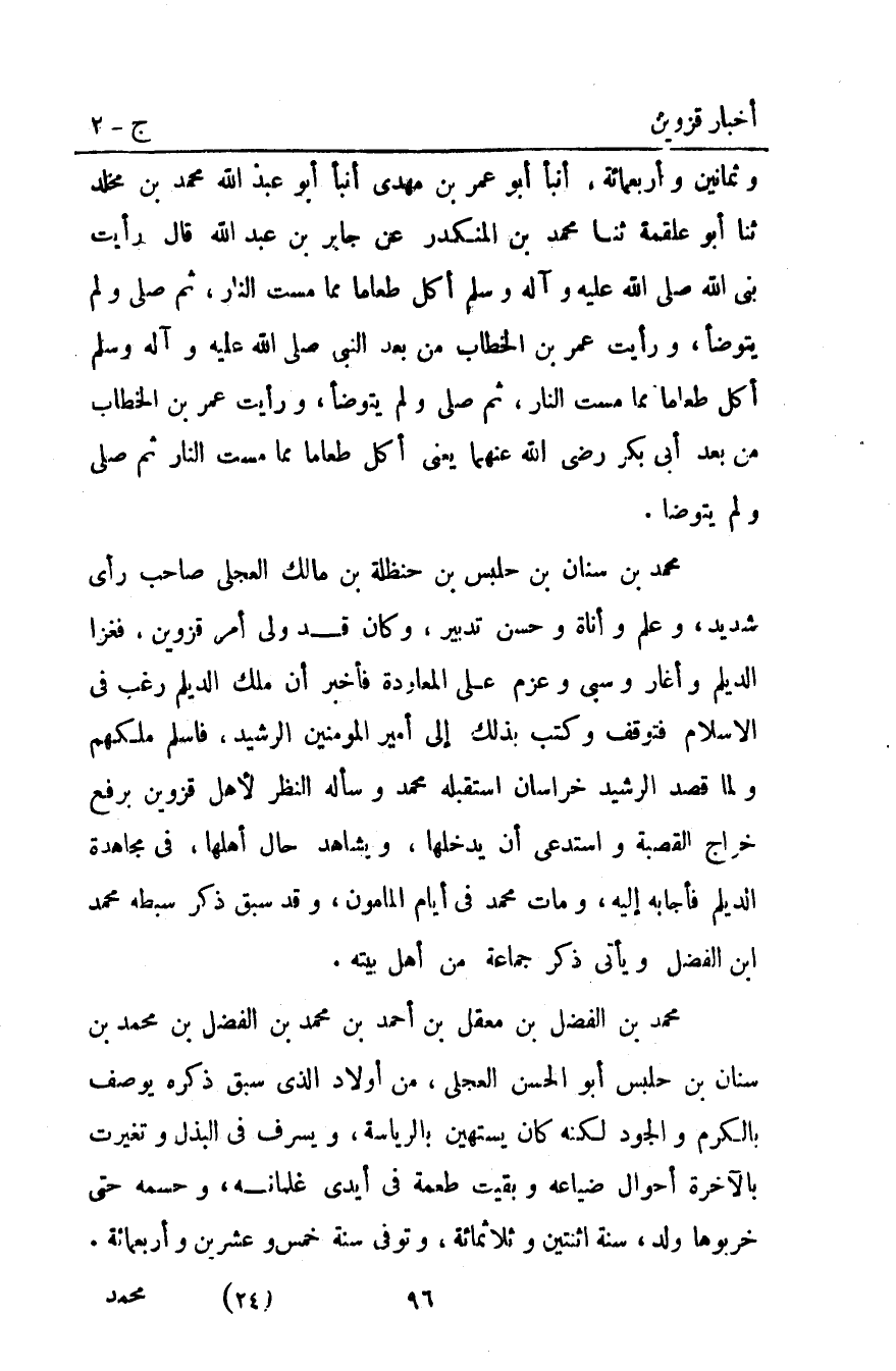 وثمانين وأربعمائة أَنْبَأَ أَبُو عُمَرَ بْنُ مَهْدِيٍّ أَنْبَأَ أَبُو عَبْدِ اللَّهِ مُحَمَّدُ بْنُ مَخْلَدٍ ثنا عَلْقَمَةُ ثنا مُحَمَّدِ بْنِ الْمُنْكَدِرِ عَنْ جَابِرِ بْنِ عَبْدِ اللَّهِ قَالَ رَأَيْتُ نَبِيُّ اللَّهِ صَلَّى اللَّهُ عَلَيْهِ وآله وَسَلَّمَ أَكَلَ طَعَامًا مِمَّا مَسَّتِ النَّارُ ثُمَّ صَلَّى وَلَمْ يَتَوَضَّأْ وَرَأَيْتُ عُمَرَ بْنَ الْخَطَّابِ مِنْ بَعْدِ النَّبِيِّ صَلَّى اللَّهُ عَلَيْهِ وآله وسلم صَلَّى اللَّهُ عَلَيْهِ وَآلِهِ وَسَلَّمَ أَكَلَ طَعَامًا مِمَّا مَسَّتِ النَّارُ ثُمَّ صَلَّى وَلَمْ يَتَوَضَّأْ وَرَأَيْتُ عمر الْخَطَّابِ مِنْ بَعْدِ أَبِي بَكْرٍ رَضِيَ اللَّهُ عَنْهُمَا يَعْنِي أَكَلَ طَعَامًا مِمَّا مَسَّتِ النَّارُ ثُمَّ صَلَّى وَلَمْ يَتَوَضَّأْ.