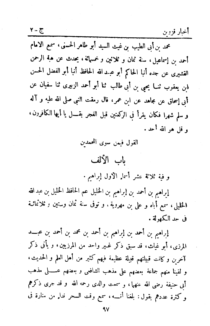 مُحَمَّد بْن أبي الطيب بْن غيث السيد أَبُو طاهر الحسني سمع الإمام أَحْمَد بْن إسماعيل سنة ثمان وثلاثين وخمسمائة يحدث عن هبة الرحمن القشيري عن جده أَنْبَأَ الْحَاكِمُ أَبُو عَبْد اللَّهِ الْحَافِظُ أَنْبَأَ أَبُو الفضل الحسن ابن يَعْقُوبَ ثنا يَحْيَى بْنُ أَبِي طَالِبٍ ثنا أَبُو أَحْمَد الزُّبَيْرِيُّ ثنا سُفْيَانُ عَنْ أَبِي إِسْحَاقَ عَنْ مُجَاهِدٍ عَنِ ابْنِ عُمَرَ قَالَ رَمَقْتُ النَّبِيَّ صَلَّى اللَّهُ عليه وآله وسلم صَلَّى اللَّهُ عَلَيْهِ وَآلِهِ وَسَلَّمَ شَهْرًا فَكَانَ يَقْرَأُ فِي الرَّكْعَتَيْنِ قبل الفجر ب: {قُلْ يَا أَيُّهَا الْكَافِرُونَ} وَ {قُلْ هُوَ اللَّهُ أَحَدٌ} .