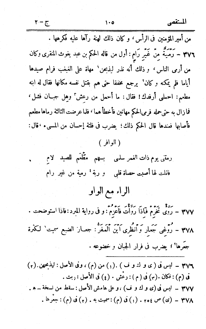 376 - رمية من غير رام أول من قَالَه الحكم بن عبد يَغُوث المنقرى وَكَانَ من أرمى النَّاس وَذَلِكَ أَنه نذر لَيَذْبَحَن مهاة على الغبغب فرام صيدها أَيَّامًا فَلم يُمكنهُ وَكَانَ يرجع مخفقا حَتَّى هم بقتل نَفسه مَكَانهَا فَقَالَ لَهُ ابْنه مطعم احملنى أرفدك فَقَالَ مَا أحمل من رعش وَهل جبان فشل فَمَا زَالَ بِهِ حَتَّى حمله فَرمى الحكم مهاتين فأخطأهما فَلَمَّا عرضت الثَّالِثَة رَمَاهَا مطعم فأصابها فَعندهَا قَالَ الحكم ذَلِك يضْرب فى فلتة إِحْسَان من المسىء قَالَ