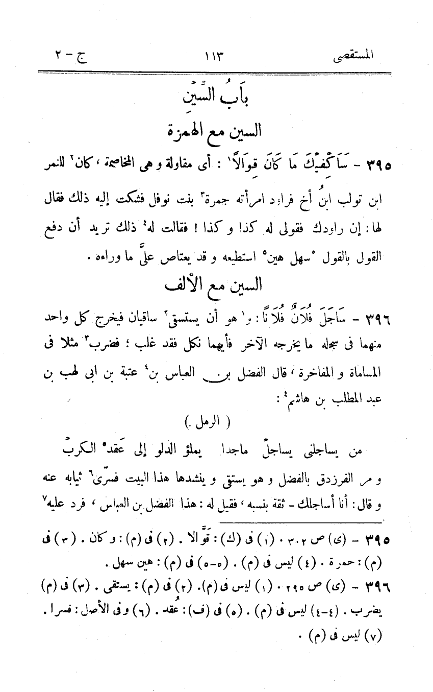 396 - ساجل فلَان فلَانا وَهُوَ أَن يستسقى ساقيان فَيخرج كل وَاحِد مِنْهُمَا فى سجله مَا يُخرجهُ الآخر فَأَيّهمَا نكل فقد غلب فَضرب مثلا فى المساماة والمفاخرة قَالَ الْفضل بن الْعَبَّاس بن عتبَة بن ابى لَهب بن عبد الْمطلب بن هَاشم