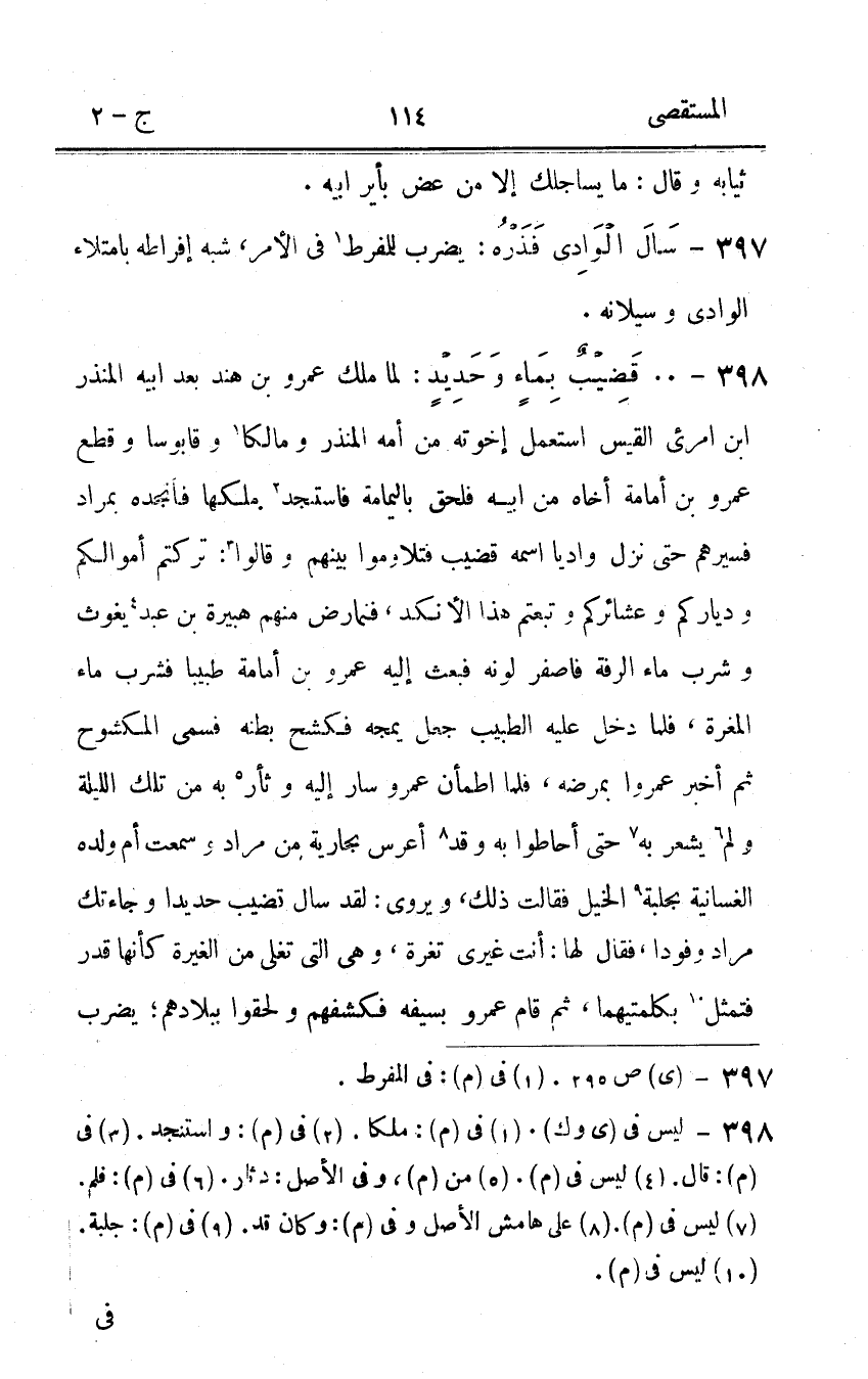 398 - 00 قضيب بِمَاء وحديد لما ملك عَمْرو بن هِنْد بعد أَبِيه الْمُنْذر ابْن امرىء الْقَيْس اسْتعْمل إخْوَته من امهِ الْمُنْذر ومالكا وقابوسا وَقطع عَمْرو بن أُمَامَة أَخَاهُ من أَبِيه فلحق بِالْيَمَامَةِ فاستجد ملكهَا فأنجده بِمُرَاد فسيرهم حَتَّى نزل وَاديا اسْمه قضيب فتلاوموا بَينهم وَقَالُوا تركْتُم أَمْوَالكُم ودياركم وعشائركم وتبعتم هَذَا الأنكد فنمارض مِنْهُم هُبَيْرَة بن عبد يَغُوث وَشرب مَاء الرفة فاصفر لَونه فَبعث إِلَيْهِ عَمْرو بن أُمَامَة طَبِيبا فَشرب مَاء الْمغرَة فَلَمَّا دخل عَلَيْهِ الطَّبِيب جعل يمجه فكشح بَطْنه فَسمى المكشوح ثمَّ أخبر عمروا بمرضه فَلَمَّا اطْمَأَن عَمْرو سَار إِلَيْهِ وثأر بِهِ من تِلْكَ اللَّيْلَة وَلم يشْعر بِهِ حَتَّى أحاطوا بِهِ وَقد أعرس بِجَارِيَة من مُرَاد وَسمعت أم وَلَده الغسانية بجلبة الْخَيل فَقَالَت ذَلِك ويروى لقد سَالَ قضيب حديدا وجاءتك مُرَاد وفودا فَقَالَ لَهَا أَنْت غيرى تغرة وهى الَّتِى تغلى من الغية ى كَأَنَّهَا قدر فتمثل بكلمتيهما ثمَّ قَامَ عَمْرو بِسَيْفِهِ فكشفهم وَلَحِقُوا ببلادهم يضْرب