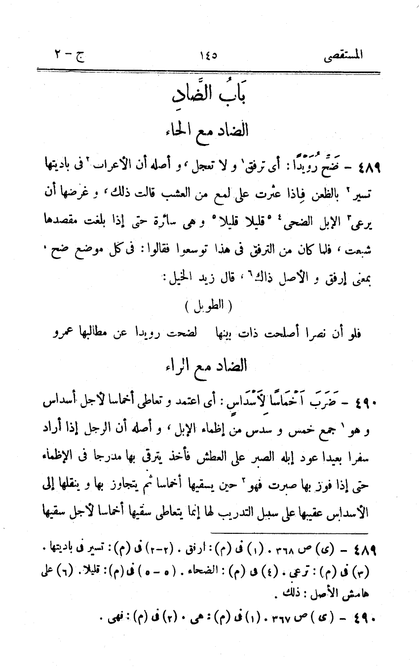 489 - ضح رويدا أى ترفق وَلَا تعجل وَأَصله أَن الْأَعْرَاب فى باديتها تسير بالظعن فاذا عثرت على لمع من العشب قَالَت ذَلِك وغرضها أَن يرْعَى الْإِبِل الضُّحَى قَلِيلا قَلِيلا وهى سائرة حَتَّى إِذا بلغت مقصدها شبعت فَلَمَّا كَانَ من الترفق فى هَذَا توسعوا فَقَالُوا فى كل مَوضِع ضح بِمَعْنى إرفق وَالْأَصْل ذَاك قَالَ زيد الْخَيل