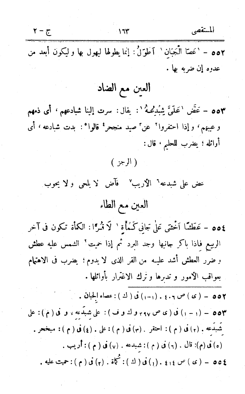 554 - عطشا اخشى على جاني كمأة لاقرا الكمأة تكون فى آخر الرّبيع فاذا باكر جانيها وجد الْبرد ثمَّ إِذا حميت الشَّمْس عَلَيْهِ عَطش وضرر الْعَطش أَشد عَلَيْهِ من القر الذى لَا يَدُوم يضْرب فى الاهتمام بعواقب الْأُمُور وتدبرها وَترك الأغترار بأوائلها