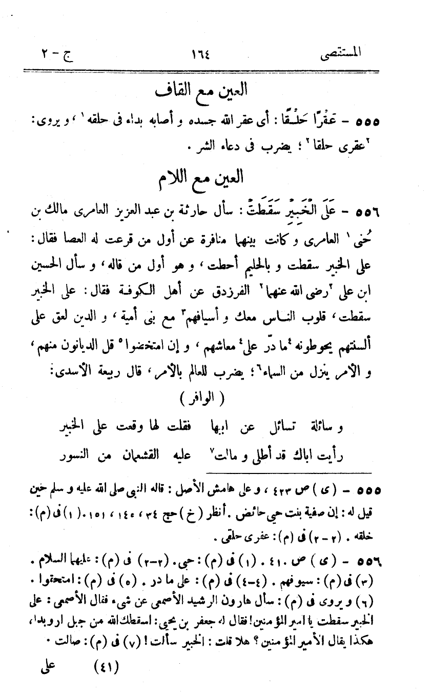 556 - على الْخَبِير سَقَطت سَأَلَ حَارِثَة بن عبد الْعَزِيز العامرى مَالك بن حَنى العامرى وَكَانَت بَينهمَا منافرة عَن أول من قرعت لَهُ الْعَصَا فَقَالَ على الْخَبِير سَقَطت وبالحليم أحطت وَهُوَ أول من قَالَه وَسَأَلَ الْحُسَيْن ابْن على رضى الله عَنْهُمَا الفرزدق عَن أهل الْكُوفَة فَقَالَ على الْخَبِير سَقَطت قُلُوب النَّاس مَعَك وأسيافهم مَعَ بنى أُميَّة وَالدّين لعق على ألسنتهم يحوطونه مَا در على معاشهم وَإِن امتخضوا قل الديانون مِنْهُم وَالْأَمر ينزل من السَّمَاء يضْرب للْعَالم بِالْأَمر قَالَ ربيعَة الأسدى