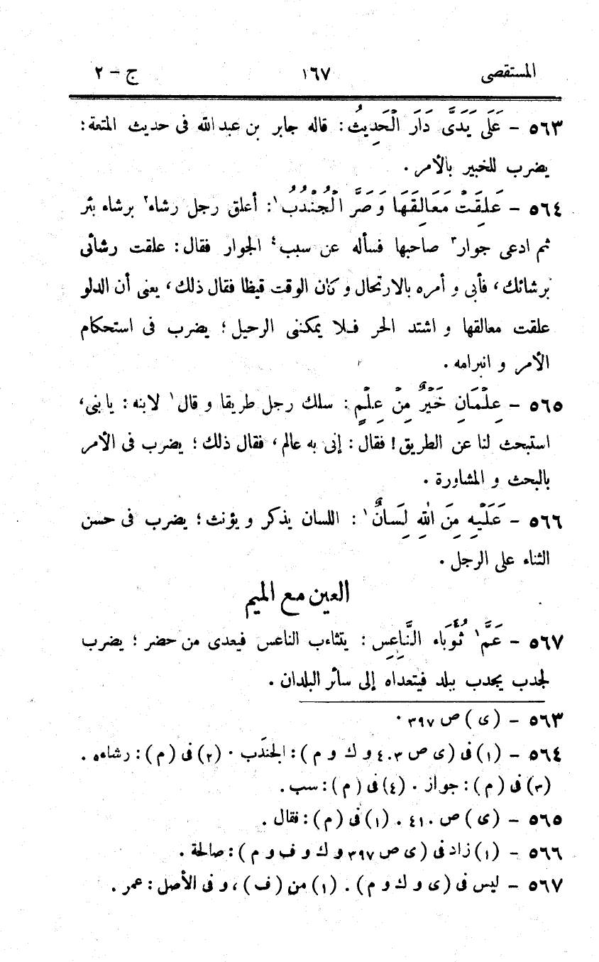 564 - علقت معالقها وصر الجندب أعلق رجل رشاء برشاء بِئْر ثمَّ ادّعى جوَار صَاحبهَا فَسَأَلَهُ عَن سَبَب الْجوَار فَقَالَ علقت رشائى برشائك فَأبى وَأمره بالارتحال وَكَانَ الْوَقْت قيظا فَقَالَ ذَلِك يعْنى أَن الدَّلْو علقت معالقها وَاشْتَدَّ الْحر فَلَا يمكننى الرحيل يضْرب فى استحكام الْأَمر وانبرامه