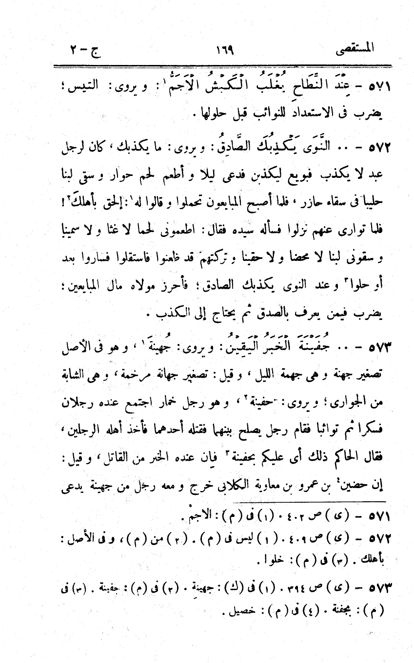 572 - 00 النَّوَى يكذبك الصَّادِق ويروى مَا يكذبك كَانَ لرجل عبد لَا يكذب فبويع ليكذبن فدعى لَيْلًا وَأطْعم لحم حوار وَسَقَى لَبَنًا حليبا فى سقاء حازر فَلَمَّا اصبح المبايعون تحملوا وَقَالُوا لَهُ إلحق بأهلك فَلَمَّا توارى عَنْهُم نزلُوا فَسَأَلَهُ سَيّده فَقَالَ اطعمونى لَحْمًا لاغثا وَلَا سمينا وسقونى لَبَنًا لَا مَحْضا وَلَا حقينا وتركتهم قد ظعنوا فاستقلوا فَسَارُوا بعد أَو حلوا وَعند النَّوَى يكذبك الصَّادِق فأحرز مَوْلَاهُ مَال الْمُبَايِعين يضْرب فِيمَن يعرف بِالصّدقِ ثمَّ يحْتَاج إِلَى الْكَذِب