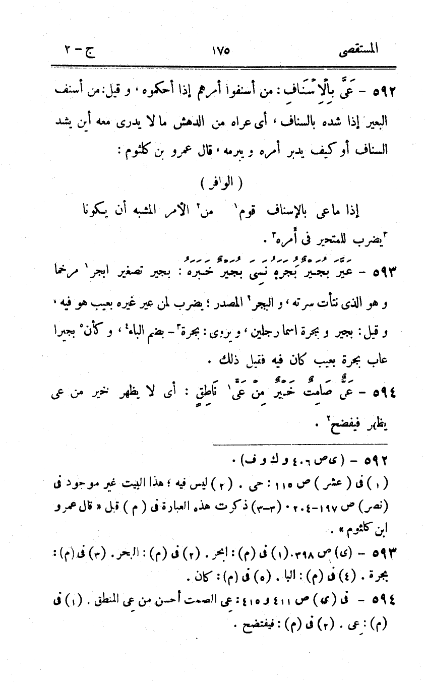 592 - عى بالاسناف من أسنفوا أَمرهم إِذا أحكموه وَقيل من اسنف الْبَعِير إِذا شده بالسناف أى عراه من الدهش مَا لَا يدرى مَعَه أَيْن يشد السناف أَو كَيفَ يدبر أمره ويبرمه قَالَ عَمْرو بن كُلْثُوم