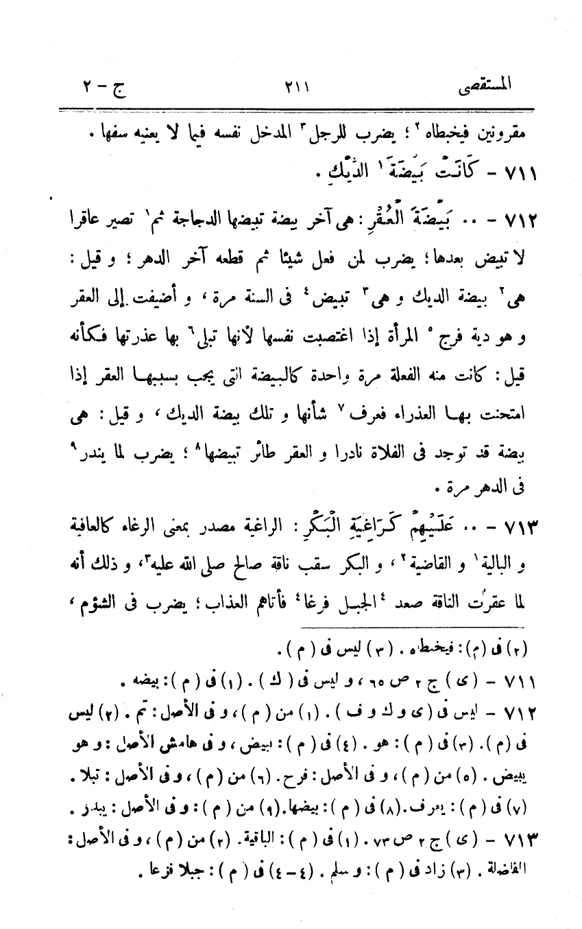 712 - 00 بَيْضَة الْعقر هى آخر بَيْضَة تبيضها الدَّجَاجَة ثمَّ تصير عاقرا لَا تبيض بعْدهَا يضْرب لمن فعل شَيْئا ثمَّ قطعه آخر الدَّهْر وَقيل هى بَيْضَة الديك وهى تبيض فى السّنة مرّة وأضيفت إِلَى الْعقر وَهُوَ دِيَة فرج الْمَرْأَة إِذا اغتصبت نَفسهَا لِأَنَّهَا تبلى بهَا عذرتها فَكَأَنَّهُ قيل كَانَت مِنْهُ الفعلة مرّة وَاحِدَة كالبيضة الَّتِى يجب بِسَبَبِهَا الْعقر إِذا امتحنت بهَا الْعَذْرَاء فَعرف شَأْنهَا وَتلك بَيْضَة الديك وَقيل هى بَيْضَة قد تُوجد فى الفلاة نَادرا والعقر طَائِر تبيضها يضْرب لما ينْدر فى الدَّهْر مرّة