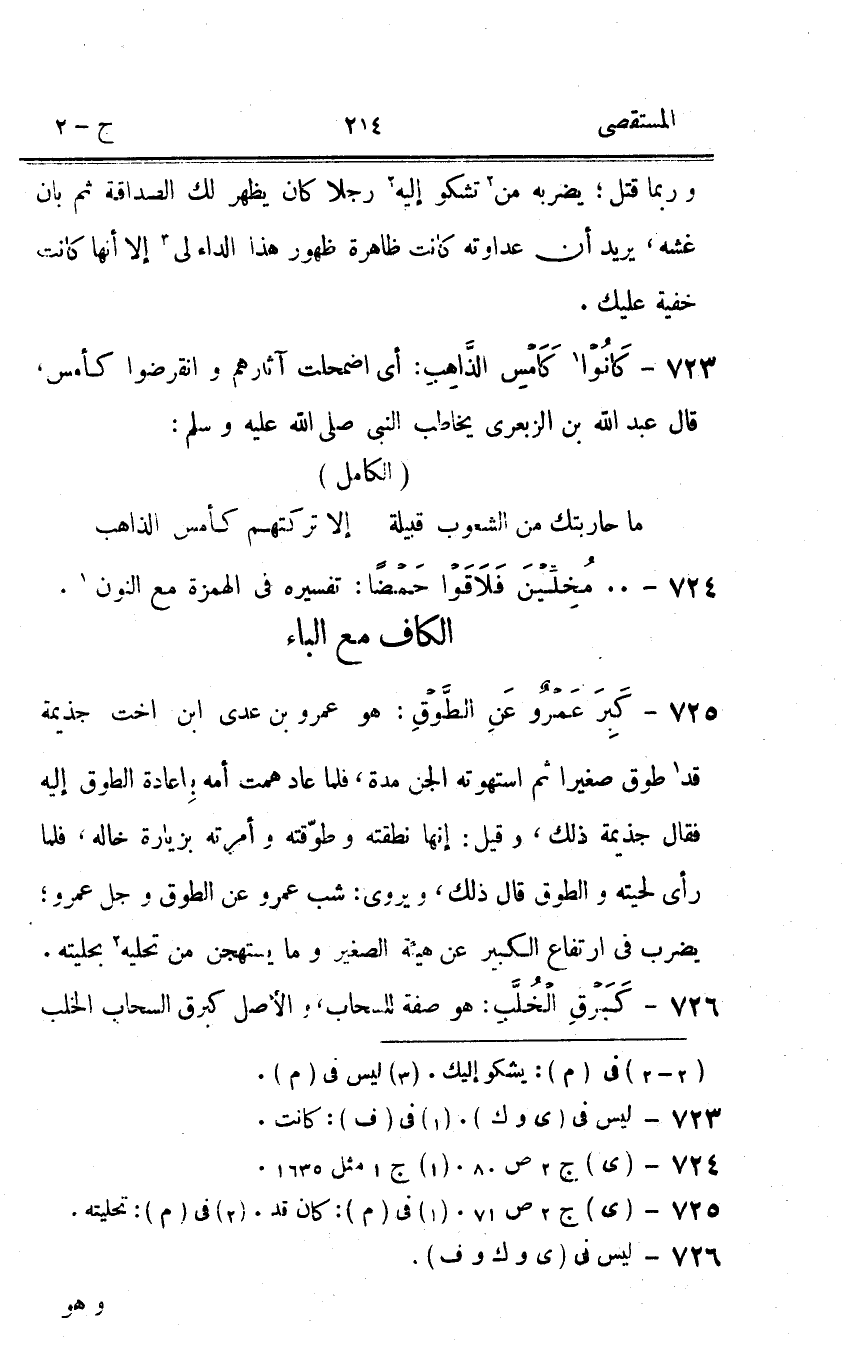 723 - كَانُوا كامس الذَّاهِب أى اضمحلت آثَارهم وانقرضوا كأمس قَالَ عبد الله بن الزبعدي يُخَاطب النبى صلى الله عَلَيْهِ وَسلم