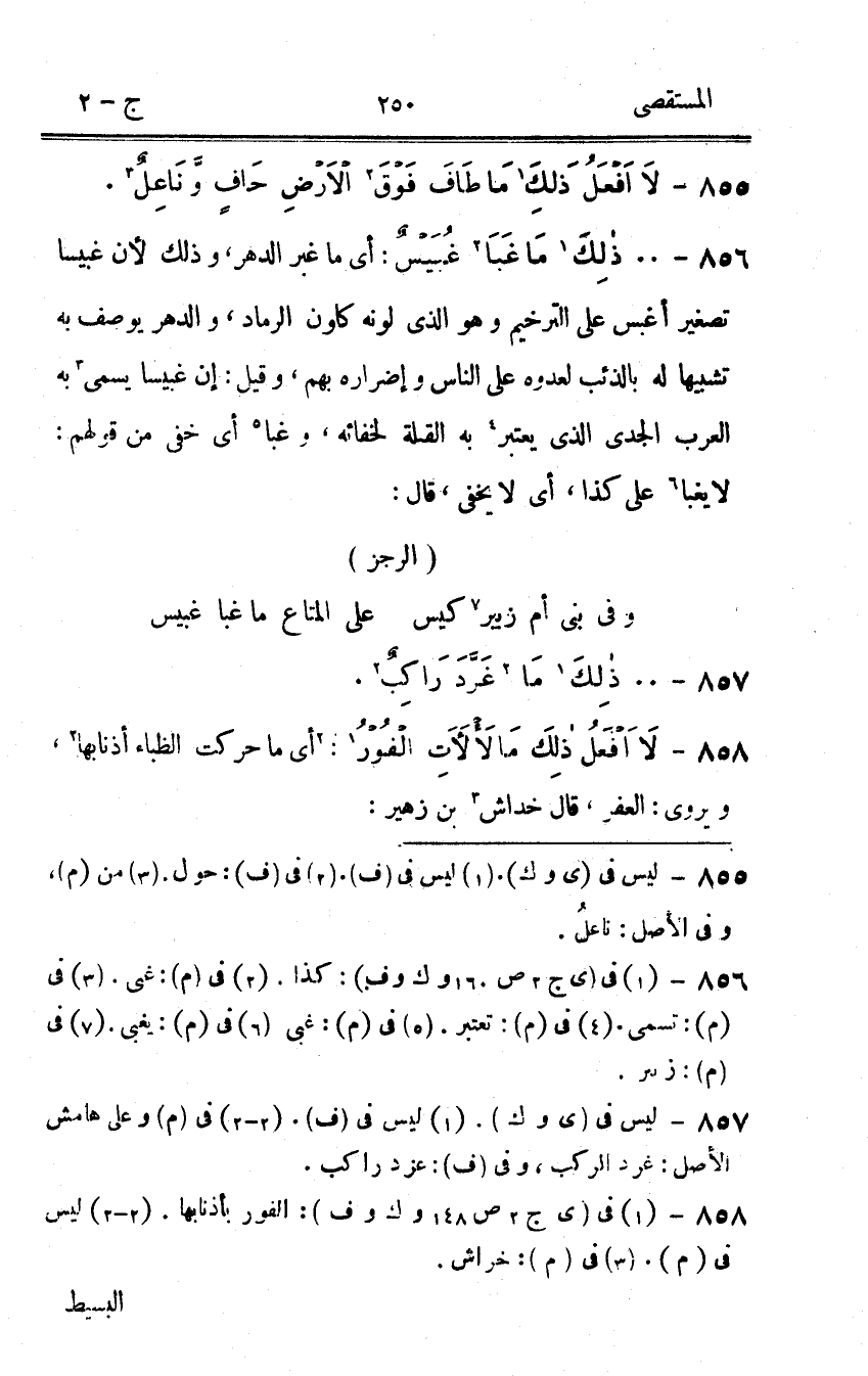 856 - ذَلِك مَا غبا غبيس أى مَا غبر الدَّهْر وَذَلِكَ لِأَن غبيسا تَصْغِير أغبس على التَّرْخِيم وَهُوَ الذى لَونه كلون الرماد والدهر يُوصف بِهِ تَشْبِيها لَهُ بالذئب لعَدوه على النَّاس وإضراره بهم وَقيل إِن غبيسا يُسمى بِهِ الْعَرَب الجدى الذى يعْتَبر بِهِ الْقلَّة لخفائه وغبا أى خفى من قَوْلهم لَا يغبا على كَذَا أى لَا يخفى قَالَ