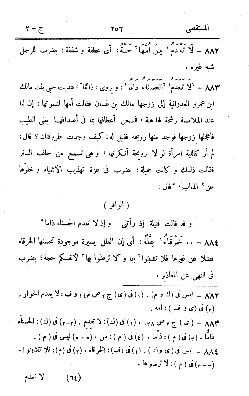 883 - لَا تعدم الْحَسْنَاء ذاما ويروى ذاما هديت حَتَّى بنت مَالك ابْن عَمْرو العدوانية إِلَى زَوجهَا مَالك بن غَسَّان فَقَالَت أمهَا لنسوتها إِن لنا عِنْد الْمُلَامسَة رشحة لَهَا هنة فمسحن أعطافها بِمَا فى أصدافها يعْنى الطّيب فأعجلها زَوجهَا فَوجدَ مِنْهَا رويحة فَقيل لَهُ كَيفَ وجدت طروقتك قَالَ لم أر كاللية امْرَأَة لَوْلَا رويحة أنكرتها وهى تسمع من خلف السّتْر فَقَالَت ذَلِك وَكَانَت جميلَة يضْرب فى عزة تَهْذِيب الْأَشْيَاء وخلوها عَن المعاب قَالَ