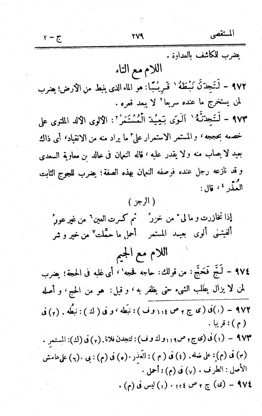 973 - لتجدنه الوى بعيد المستمر الألوى الألد الملتوى على خَصمه بحججه والمستمر الِاسْتِمْرَار على مَا يُرَاد مِنْهُ من الانقياد أى ذَاك بعيد لَا يصاب مِنْهُ وَلَا يقدر عَلَيْهِ قَالَه النُّعْمَان فى خَالِد بن مُعَاوِيَة السعدى وَقد نازعه رجل عِنْده فوصفه النُّعْمَان بِهَذِهِ الصّفة يضْرب للجوج الثَّابِت الْعذر قَالَ