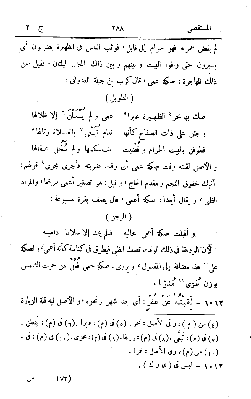لم يقْض عمرته فَهُوَ حرَام إِلَى قَابل فَوَثَبَ النَّاس فى الظهيرة يضْربُونَ أى يَسِيرُونَ حَتَّى وافوا الْبَيْت وَبينهمْ وَبَين ذَلِك الْمنزل ليلتان فَقيل من ذَلِك للهاجرة صَكَّة عمى قَالَ كرب بن جبلة العدوانى