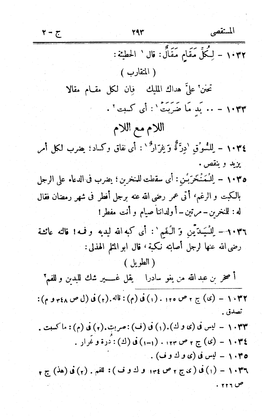1036 - لِلْيَدَيْنِ والفم أَي كَبه الله ليديه وفمه قالته عَائِشَة رَضِي الله عَنْهَا لرجل اصابته نكبة قَالَ ابو المثلم الْهُذلِيّ
