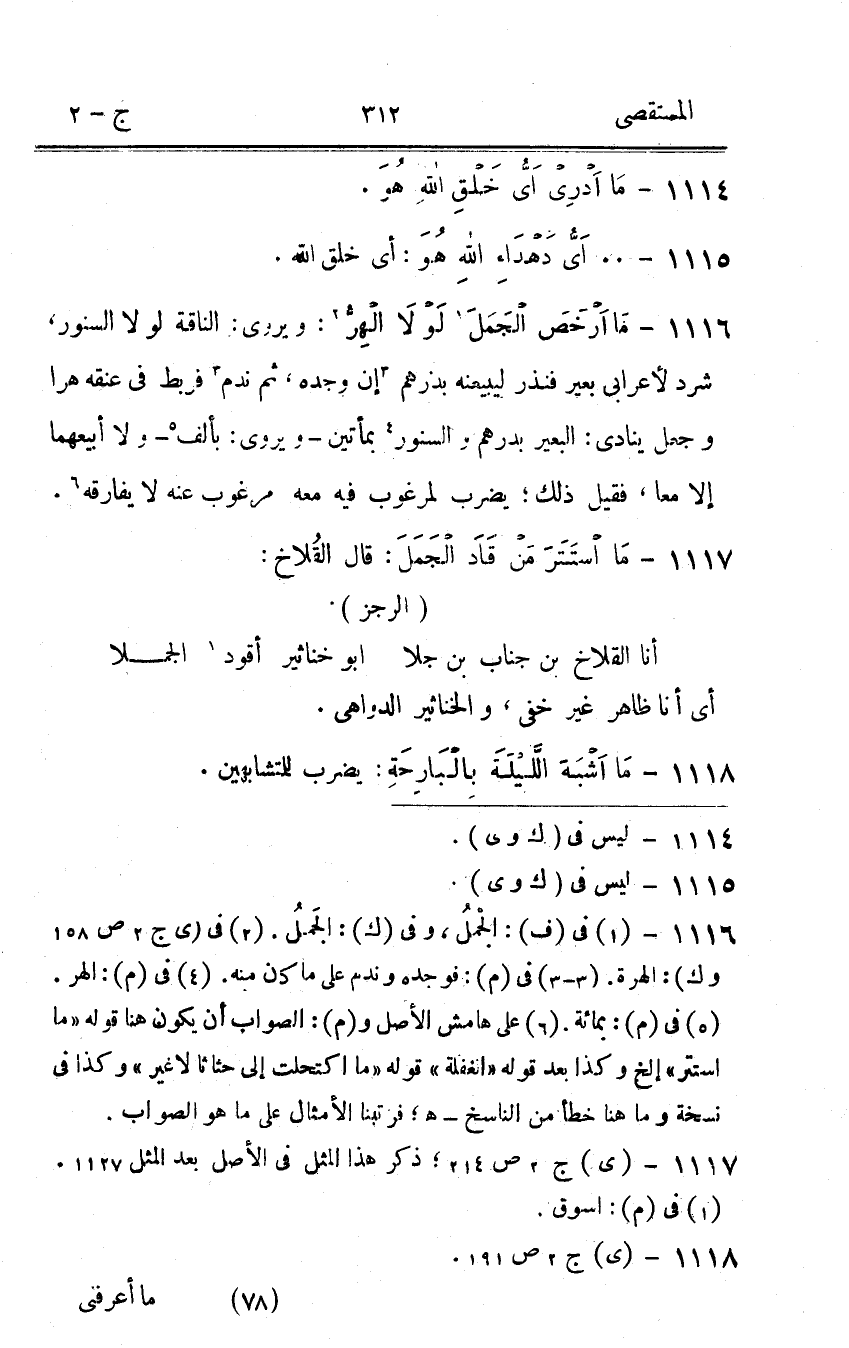 1116 - مَا ارخص الْجمل لَوْلَا الهر ويروى النَّاقة لَوْلَا السنور شرد لأعرابى بعير فَنَذر ليبيعنه بذرهم إِن وجده ثمَّ نَدم فَربط فى عُنُقه هرا وَجعل يُنَادى الْبَعِير بدرهم والسنور بمأتين ويروى بِأَلف وَلَا أبيعهما إِلَّا مَعًا فَقيل ذَلِك يضْرب لمرغوب فِيهِ مَعَه مَرْغُوب عَنهُ لَا يُفَارِقهُ