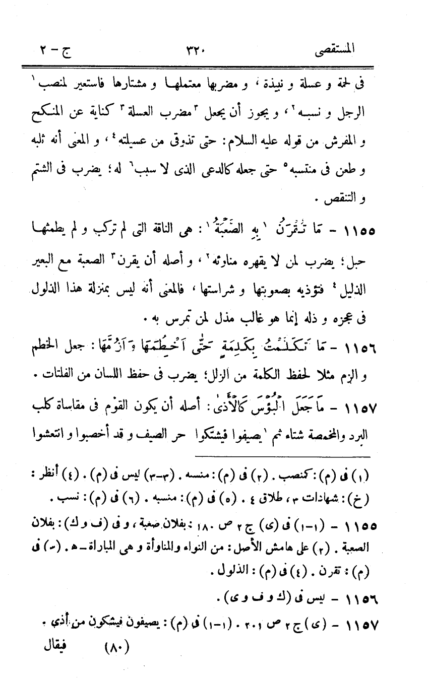 1155 - مَا تقرن بِهِ الصعبة هى النَّاقة الَّتِى لم تركب وَلم يطمثها حَبل يضْرب لمن لَا يَقْهَرهُ مناوئه وَأَصله أَن يقرن الصعبة مَعَ الْبَعِير الذَّلِيل فتؤذيه بصعوبتها وشراستها فَالْمَعْنى أَنه لَيْسَ بِمَنْزِلَة هَذَا الذلول فى عَجزه وذله إِنَّمَا هُوَ غَالب مذل لمن تمرس بِهِ