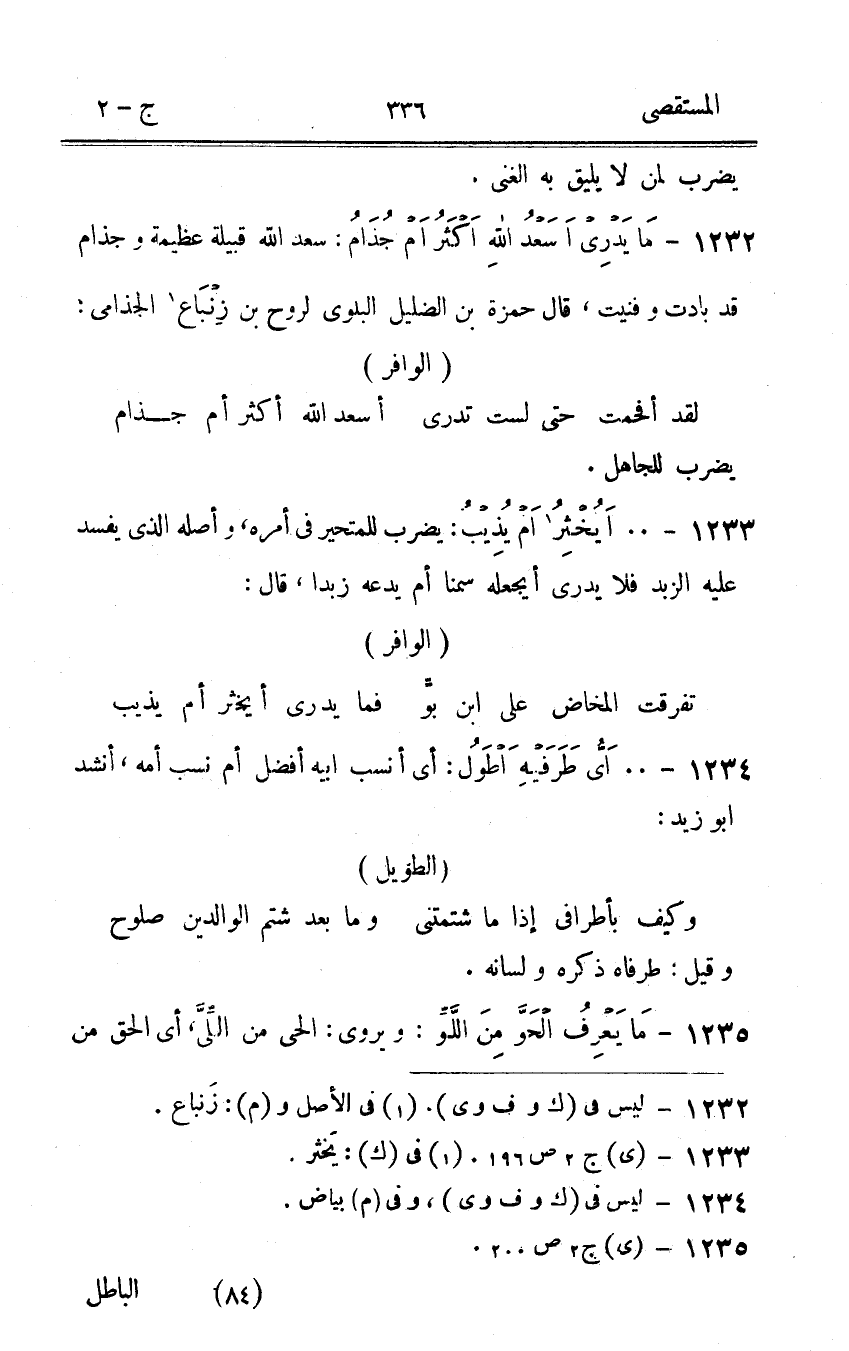 1232 - مَا يدرى اِسْعَدْ الله اكثر ام جذام سعد الله قَبيلَة عَظِيمَة وجذام قد بادت وفنيت قَالَ حَمْزَة بن الضليل الْبلوى لروح بن زنباع الجذامى
