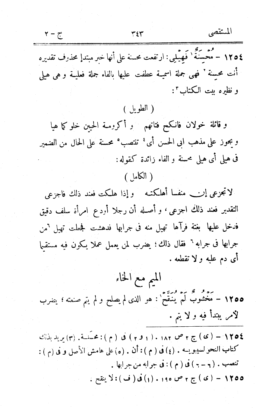 1254 - محسنة فهيلى ارْتَفَعت محسنة على أَنَّهَا خبر مبتدإ مَحْذُوف تَقْدِيره أَنْت محسنة فهى جملَة اسمية عطفت عَلَيْهَا بافاء جملَة فعلية وهى هيلى وَنَظِيره بَيت الْكتاب