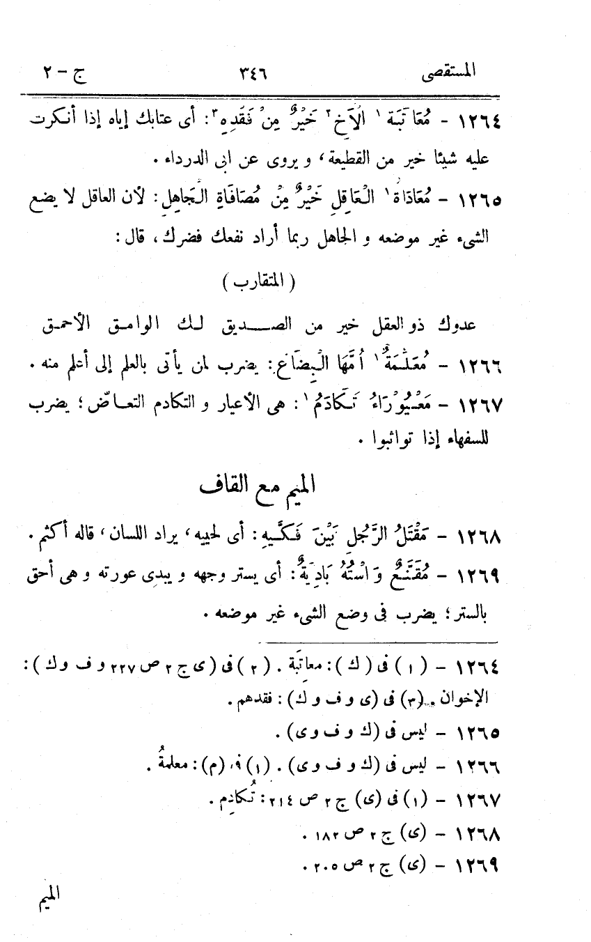 1264 - معاتبة الاخ خير من فَقده أى عتابك إِيَّاه إِذا أنْكرت عَلَيْهِ شَيْئا خير من القطيعة ويروى عَن ابى الدَّرْدَاء