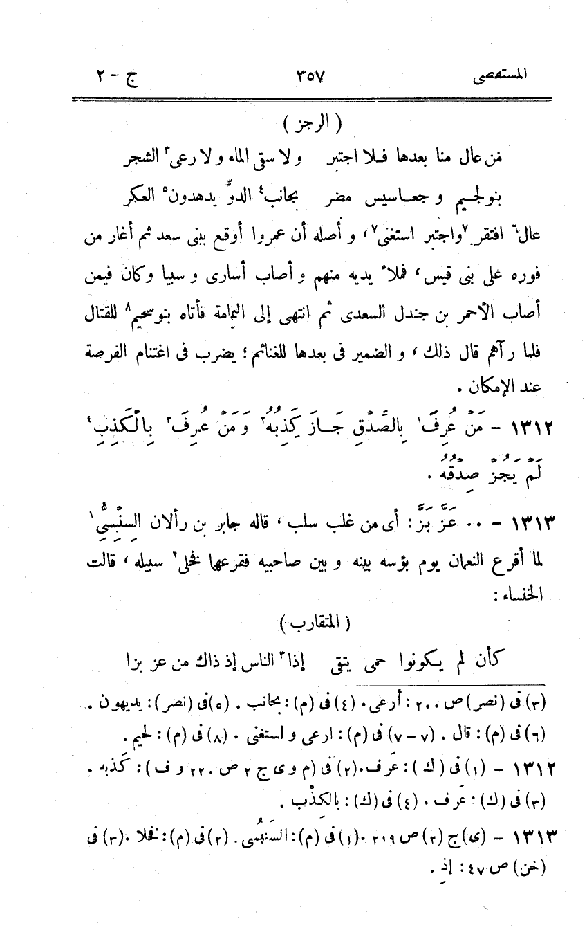 1313 - 00 عز بز أى من غلب سلب قَالَه جَابر بن رألان السنبسى لما أَقرع النُّعْمَان يَوْم بؤسه بَينه وَبَين صَاحِبيهِ فقرعهما فخلى سَبيله قَالَت الخنساء