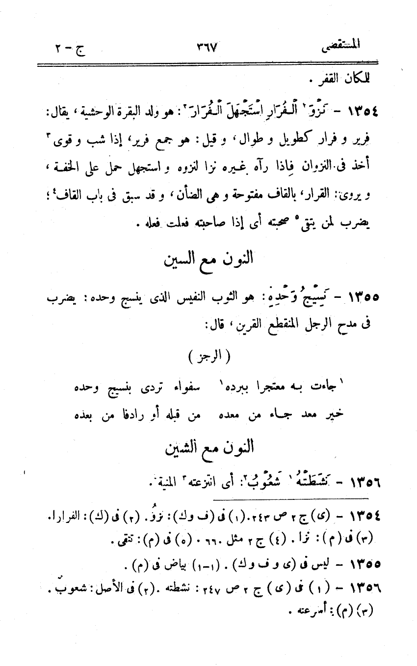 1354 - نزو الْفِرَار استجهل الْفِرَار هُوَ ولد الْبَقَرَة الوحشية يُقَال فرير وفرار كطويل وطوال وَقيل هُوَ جمع فرير إِذا شب وقوى أَخذ فى النزوان فاذا رَآهُ غَيره نزا لنزوه واستجهل حمل على الخفة ويروى الْقَرار بِالْقَافِ مَفْتُوحَة وهى الضَّأْن وَقد سبق فى بَاب الْقَاف