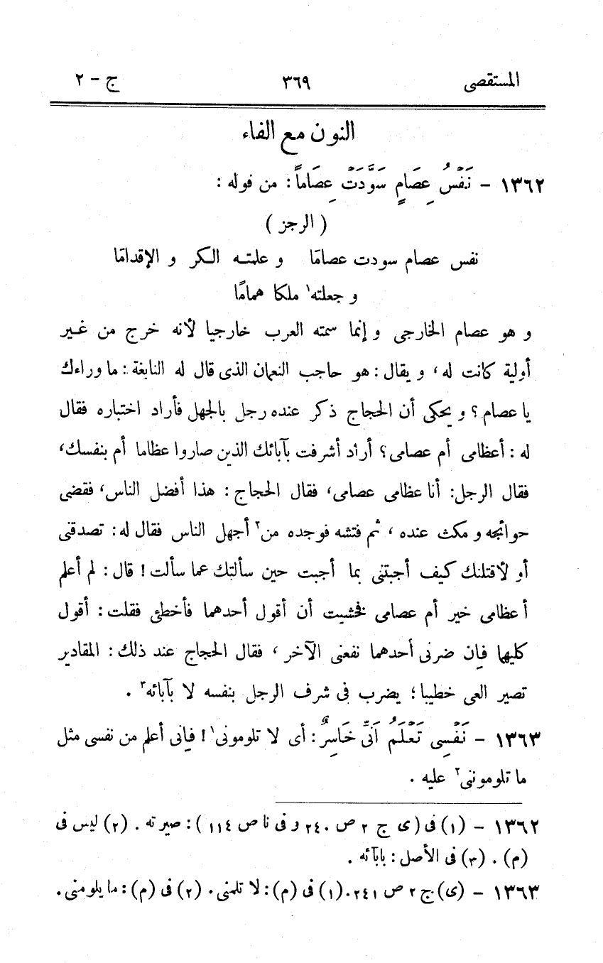 وَهُوَ عِصَام الخارجى وَإِنَّمَا سمته الْعَرَب خارجيا لِأَنَّهُ خرج من غير أولية كَانَت لَهُ وَيُقَال هُوَ حَاجِب النُّعْمَان الذى قَالَ لَهُ النَّابِغَة مَا وَرَاءَك يَا عِصَام ويحكى أَن الْحجَّاج ذكر عِنْده رجل بِالْجَهْلِ فَأَرَادَ اختباره فَقَالَ لَهُ أعظامى أم عصامى أَرَادَ أشرفت بآبائك الَّذين صَارُوا عظاما أم بِنَفْسِك فَقَالَ الرجل أَنا عظامى عصامى فَقَالَ الْحجَّاج هَذَا أفضل النَّاس فَقضى حَوَائِجه وَمكث عِنْده ثمَّ فتشه فَوَجَدَهُ من أَجْهَل النَّاس فَقَالَ لَهُ تصدقنى أَو لأَقْتُلَنك كَيفَ أجبتنى بِمَا أجبْت حِين سَأَلتك عَمَّا سَأَلت قَالَ لم أعلم أعظامى خير أم عصامى فَخَشِيت أَن اقول أَحدهمَا فأخطىء فَقلت أَقُول كليهمَا فان ضرنى أَحدهمَا نفعنى الآخر فَقَالَ الْحجَّاج عِنْد ذَلِك الْمَقَادِير تصير العى خَطِيبًا يضْرب فى شرف الرجل بِنَفسِهِ لَا بآبائه
