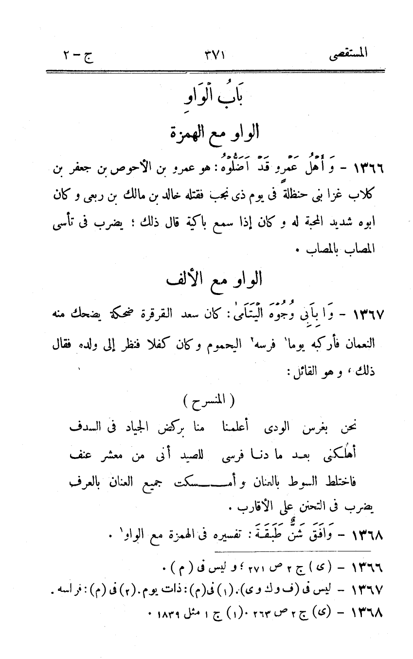 1366 - وَأهل عَمْرو قد اضلوه هُوَ عَمْرو بن الْأَحْوَص بن جَعْفَر بن كلاب غزا بنى حَنْظَلَة فى يَوْم ذى نجب فَقتله خَالِد بن مَالك بن ربعى وَكَانَ أَبوهُ شَدِيد الْمحبَّة لَهُ وَكَانَ إِذا سمع باكية قَالَ ذَلِك يضْرب فى تأسى الْمُصَاب بالمصاب