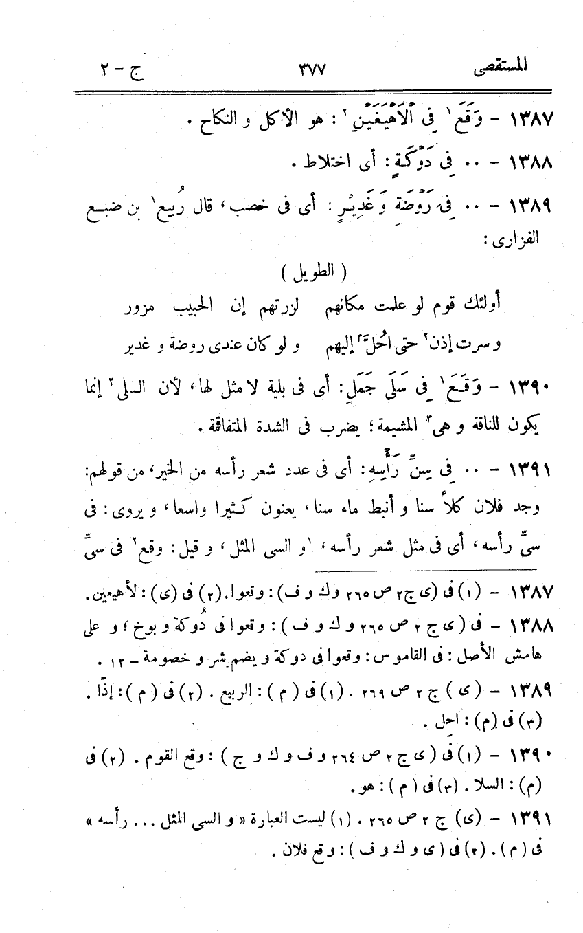 1389 - فى رَوْضَة وغدير أى فى خصب قَالَ ربيع بن ضبع الفزارى